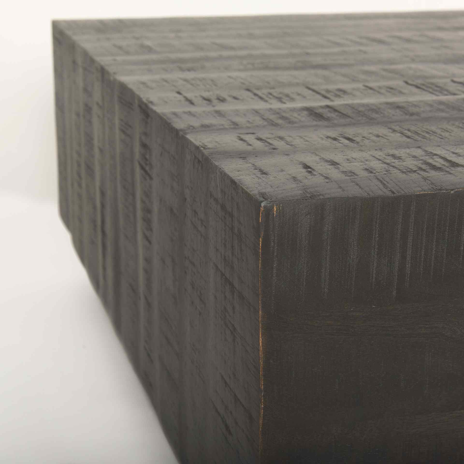 The Hayden Wooden Square Coffee Table offers a blend of rustic charm and contemporary style with its solid wood construction and brown finish. Its natural, distressed texture brings an organic depth to any living space, enriching the room with a touch of warmth. Its minimalist design features a solid, box-like top that appears to float above a recessed base, creating an eye-catching focal point. This design not only adds visual intrigue but also complements a wide range of interior styles, from rustic to modern.
