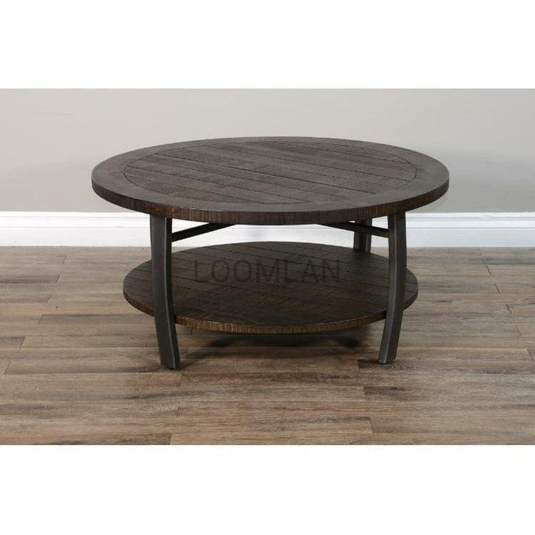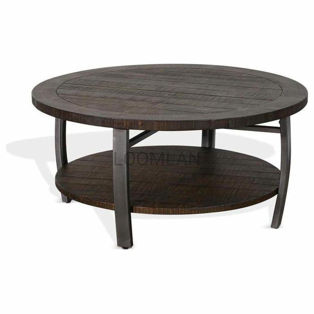 Elevate your living space with our rustic yet elegant 38" Round Dark Brown Cocktail Coffee Table with Storage Shelf. Crafted from durable mahogany wood and veneers, this table features a storage shelf and powder-coated metal bases for added functionality. Its barrel-inspired design adds a touch of timeless charm to any room.