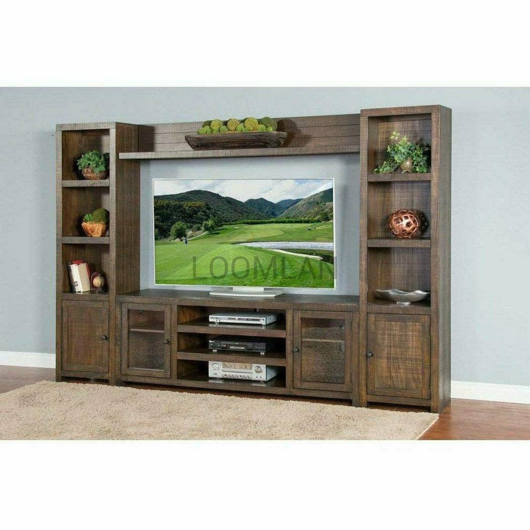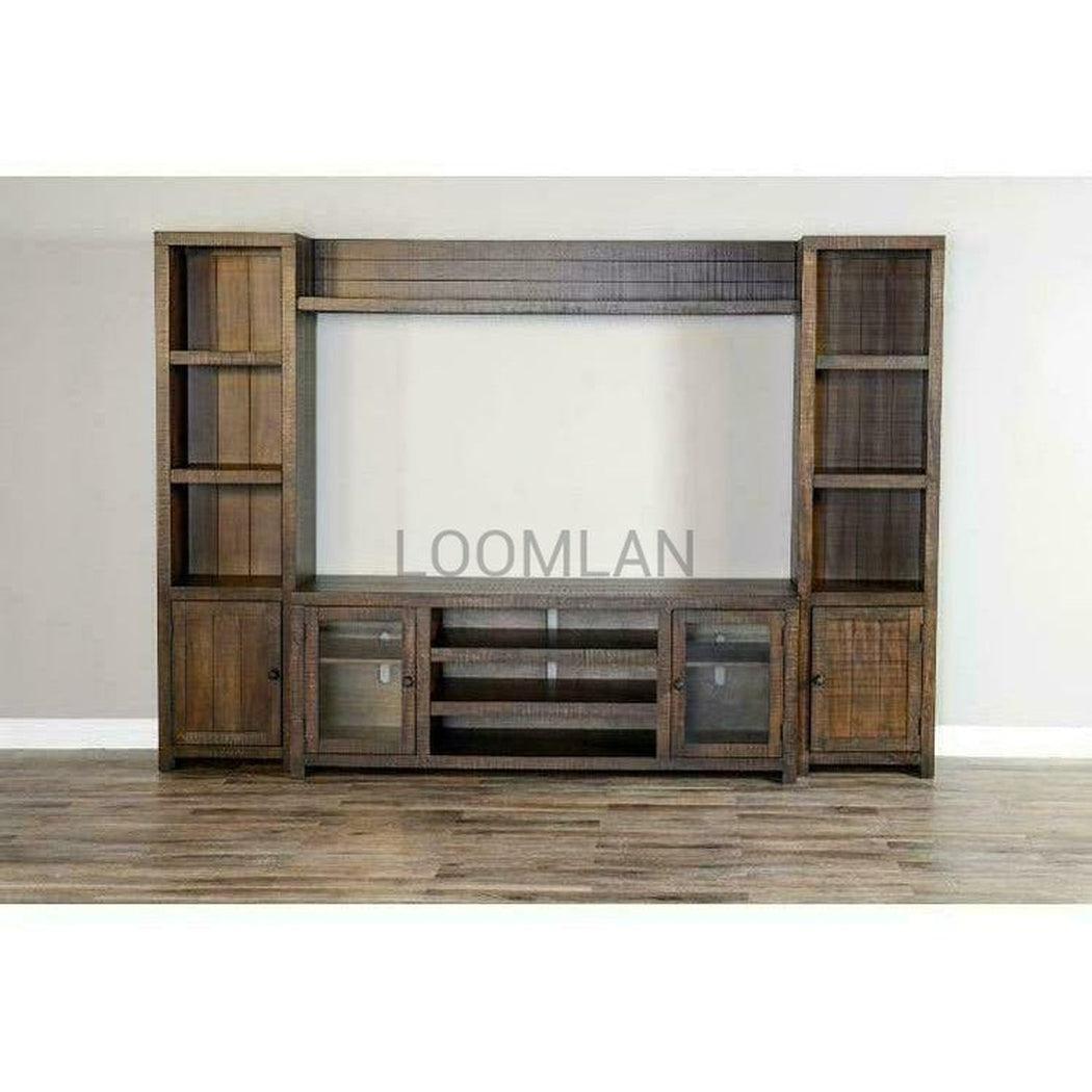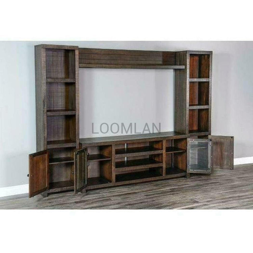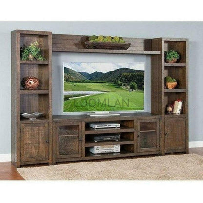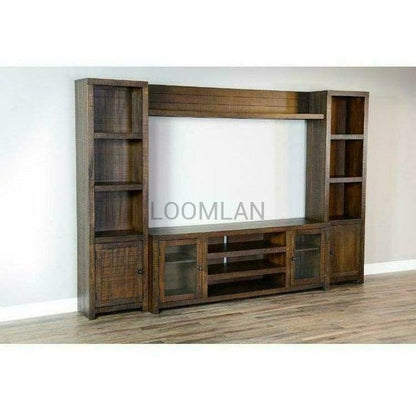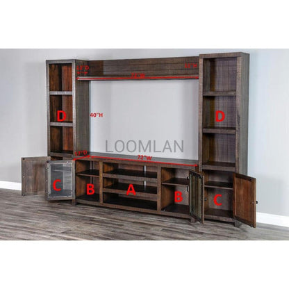 112" Wide Modern Rustic Entertainment Wall Unit For TV Up to 72" With Bookcase Features: