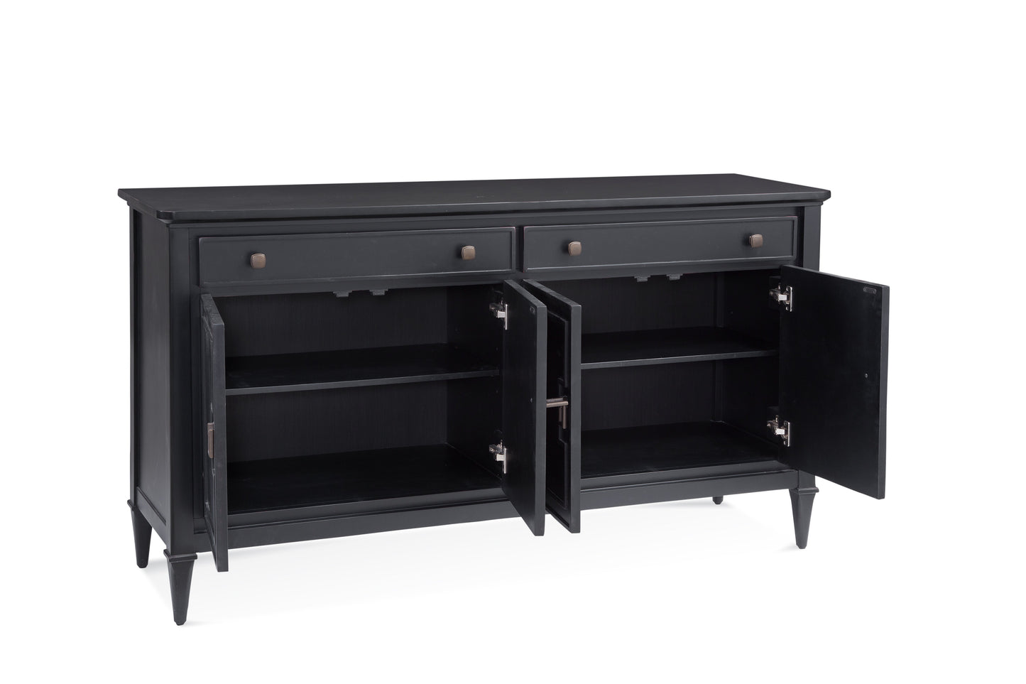 The Hudson Server features an all black finish, with geometric details giving it an Asian flair. This sideboard provides ample storage between the two upper drawers and two cabinets. The top drawers feature black felt lining.