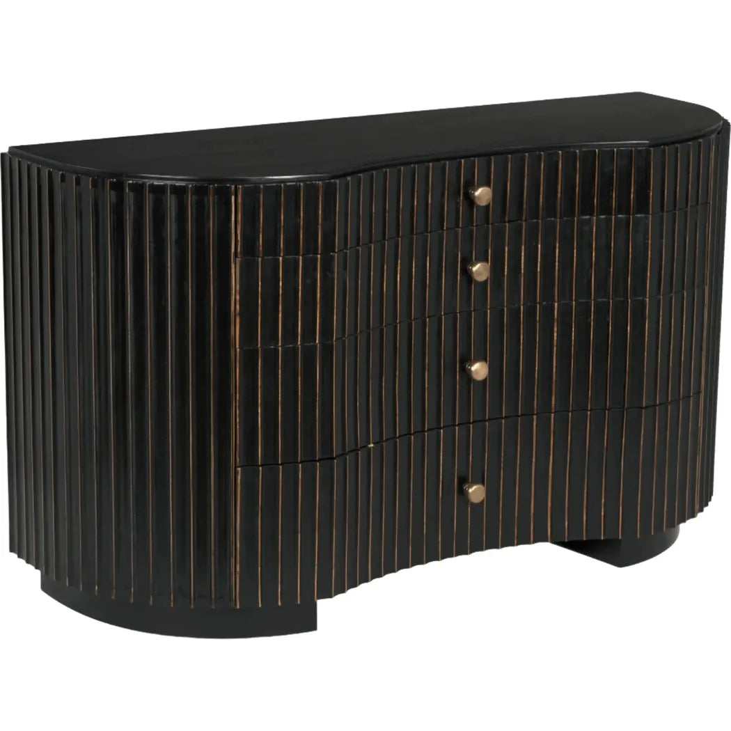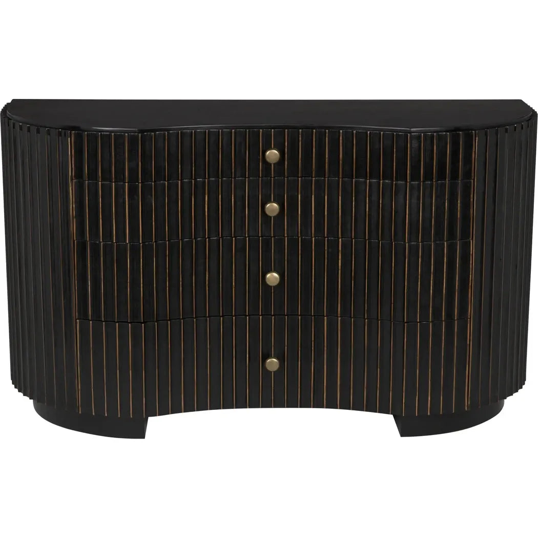 Experience the ultimate combination of style and functionality with the Irene Wood Black Dresser. Crafted with the finest materials of Mahogany, Veneer, and Brass Pulls, this dresser features a Hand Rubbed Black finish and a unique Light Brown Trim for a touch of elegance. Perfect for any bedroom, its spacious design offers practical storage while adding a sophisticated touch to your space. The Irene Dresser is a masterful composition of Mahogany, Veneer, and Brass Pulls, finished in Hand Rubbed Black with a distinctive Light Brown Trim. it offers both style and functionality for your bedroom.