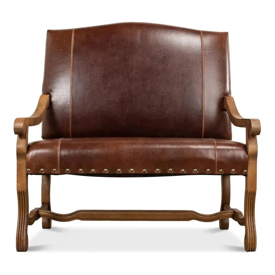 Italian Leather Settee, Sink into the supple vintage Leather and relaxed refinement of this classically styled Italian settee. Meticulously built with a sturdy oak Wood frame, this compact sofa features shelter arms and elegant tufting for visual richness. Generously padded cushions upholstered in split cowhide Leather envelope the frame in sophistication. Detailed carved Wood legs complete the vintage aesthetic.