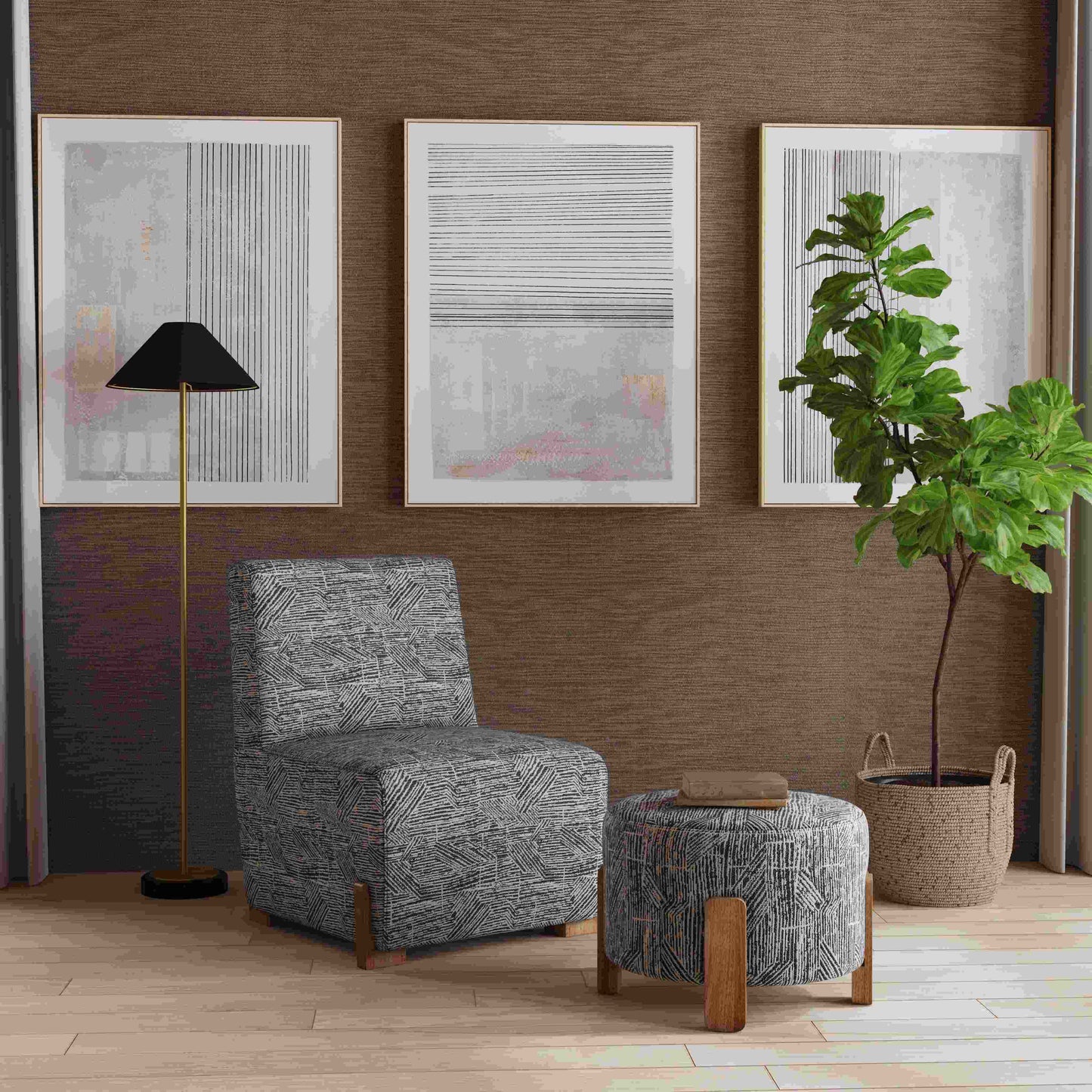 - Upholstered in durable salt-and-pepper jacquard fabric