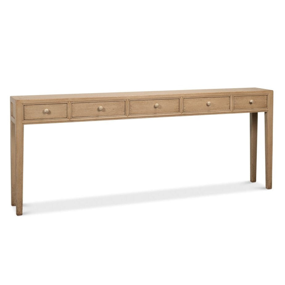 Introducing a versatile piece that blends functionality with elegance. This console table is perfect for organizing your precious jewelry collection or as a stylish addition to any dining area. Its natural finish and slim legs give it a rustic charm, while the hand-painted drawers add a touch of artistry. The table's design is both practical and aesthetically pleasing, making it a wonderful addition to various settings. Whether it’s placed in a hallway, living room, or dining area, this table effortlessly complements different styles and decors.