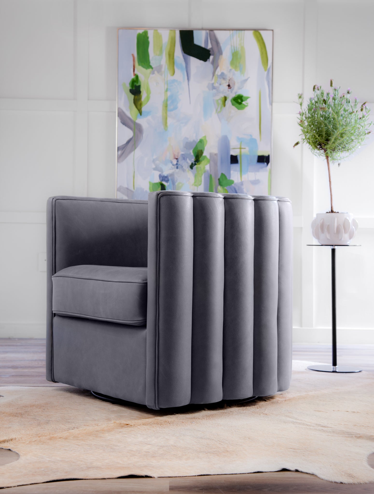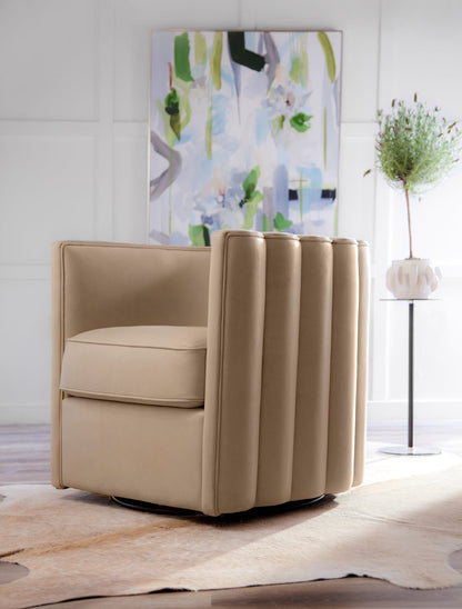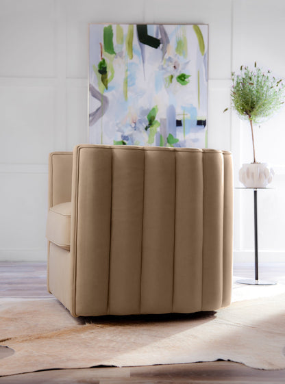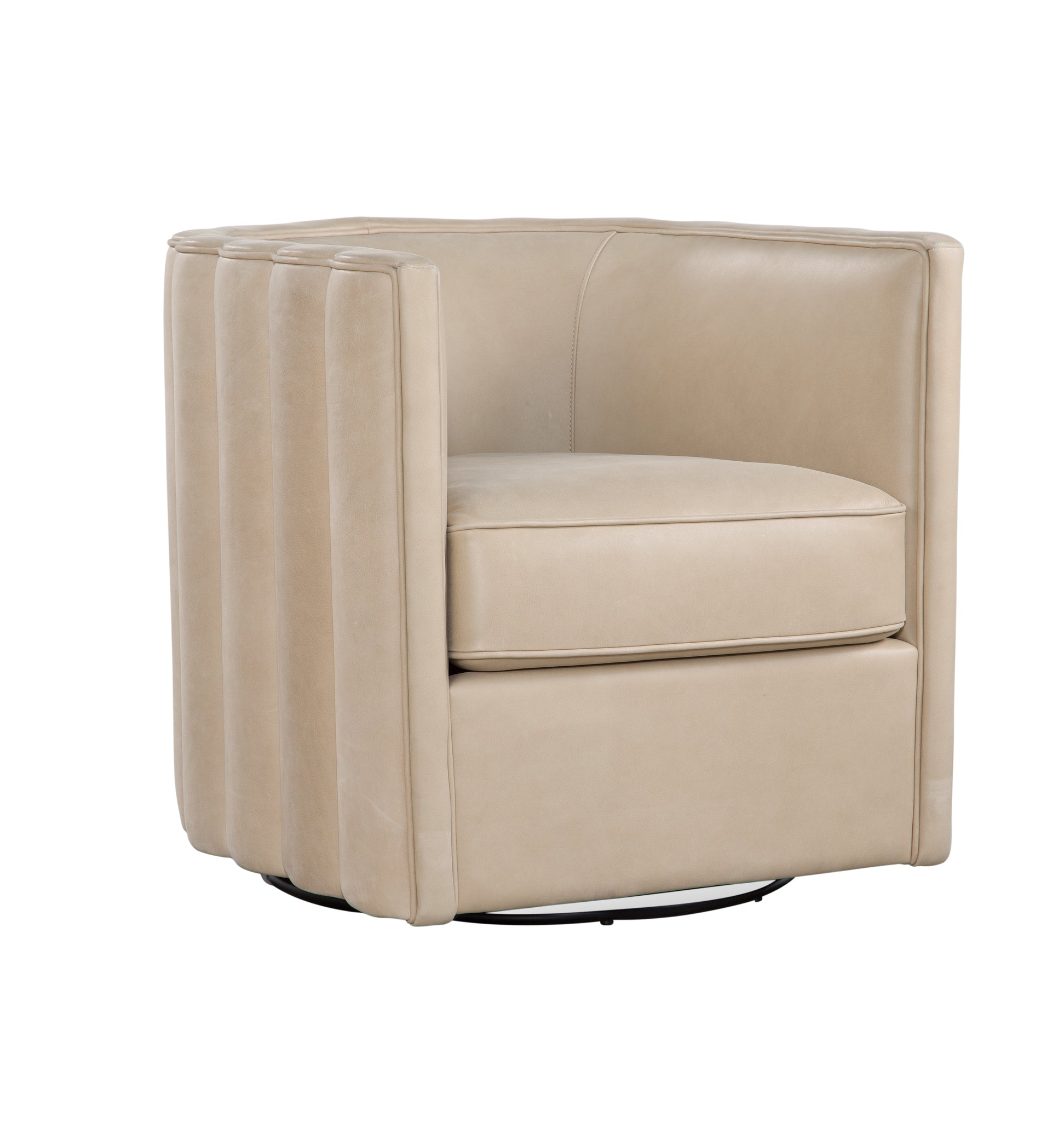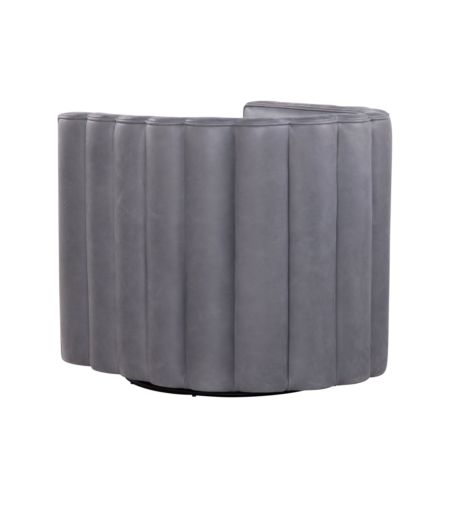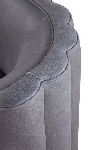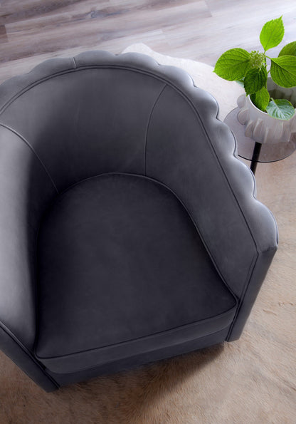 The Jones Swivel Chair is a blend of modern design and luxurious comfort, offering an elegant seating solution for any room. Crafted from top grain leather, this chair features a sleek, scalloped design that adds a sophisticated touch to your home or office. Available in two stunning finishes Selena Oat, a soft beige, and Selena Storm, a deep gray — this chair suits a wide range of decor styles, enhancing any space with its chic appearance.