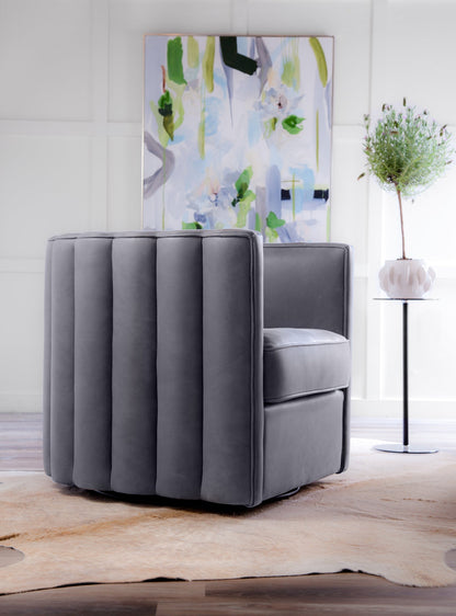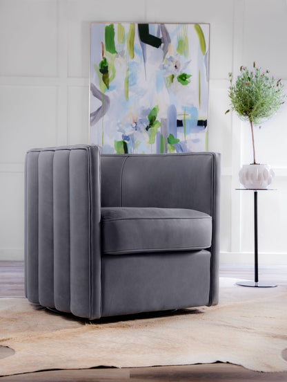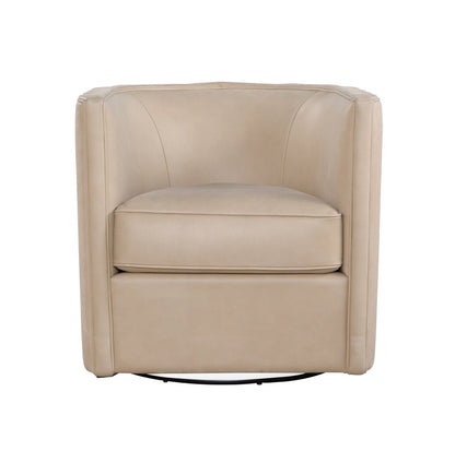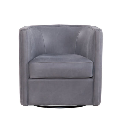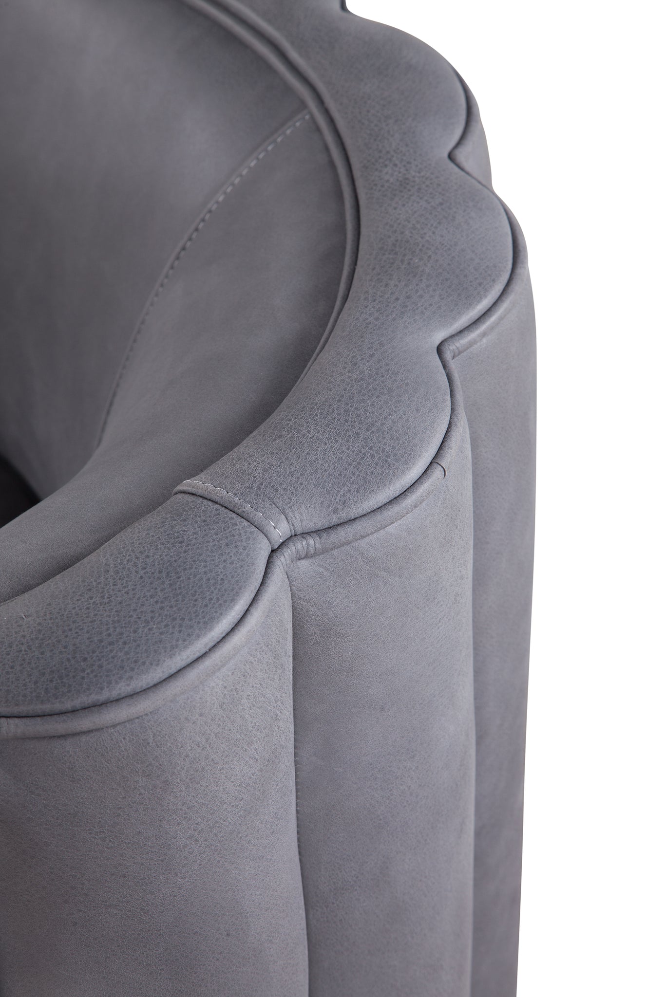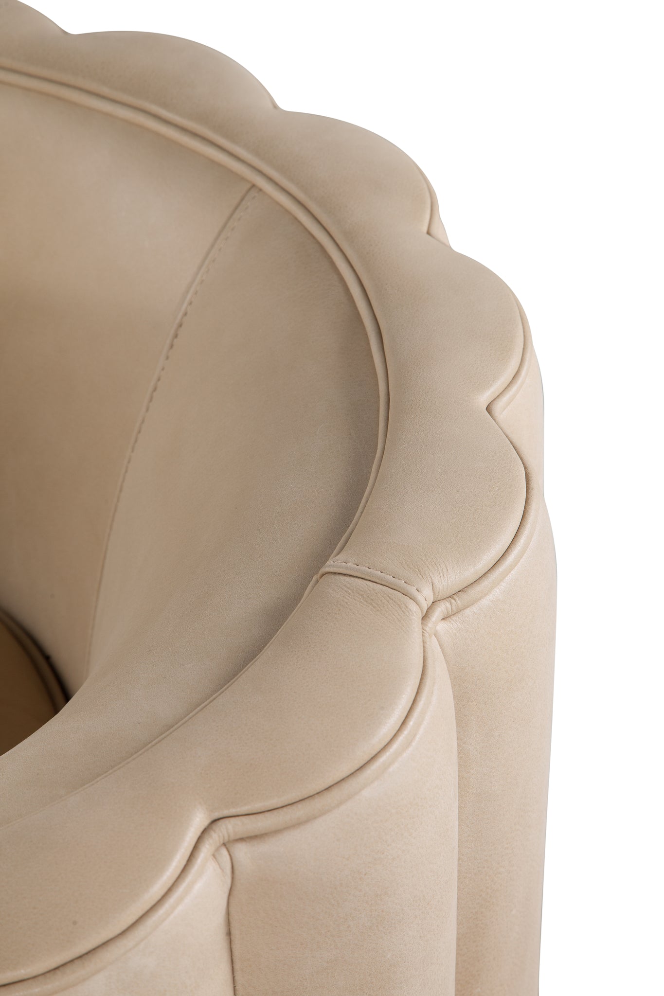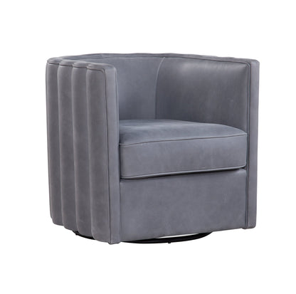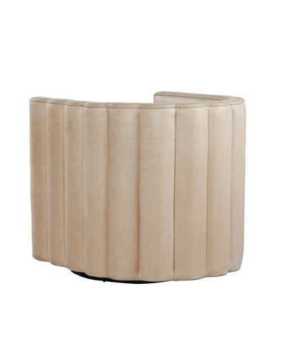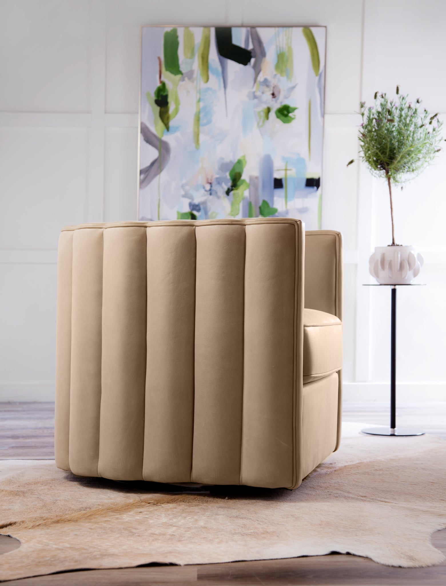 The Jones Swivel Chair is a blend of modern design and luxurious comfort, offering an elegant seating solution for any room. Crafted from top grain leather, this chair features a sleek, scalloped design that adds a sophisticated touch to your home or office. Available in two stunning finishes Selena Oat, a soft beige, and Selena Storm, a deep gray — this chair suits a wide range of decor styles, enhancing any space with its chic appearance.