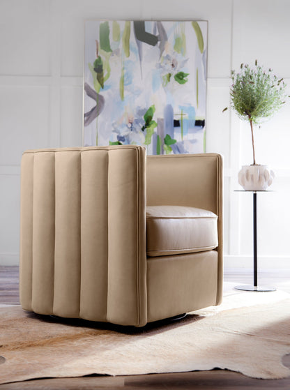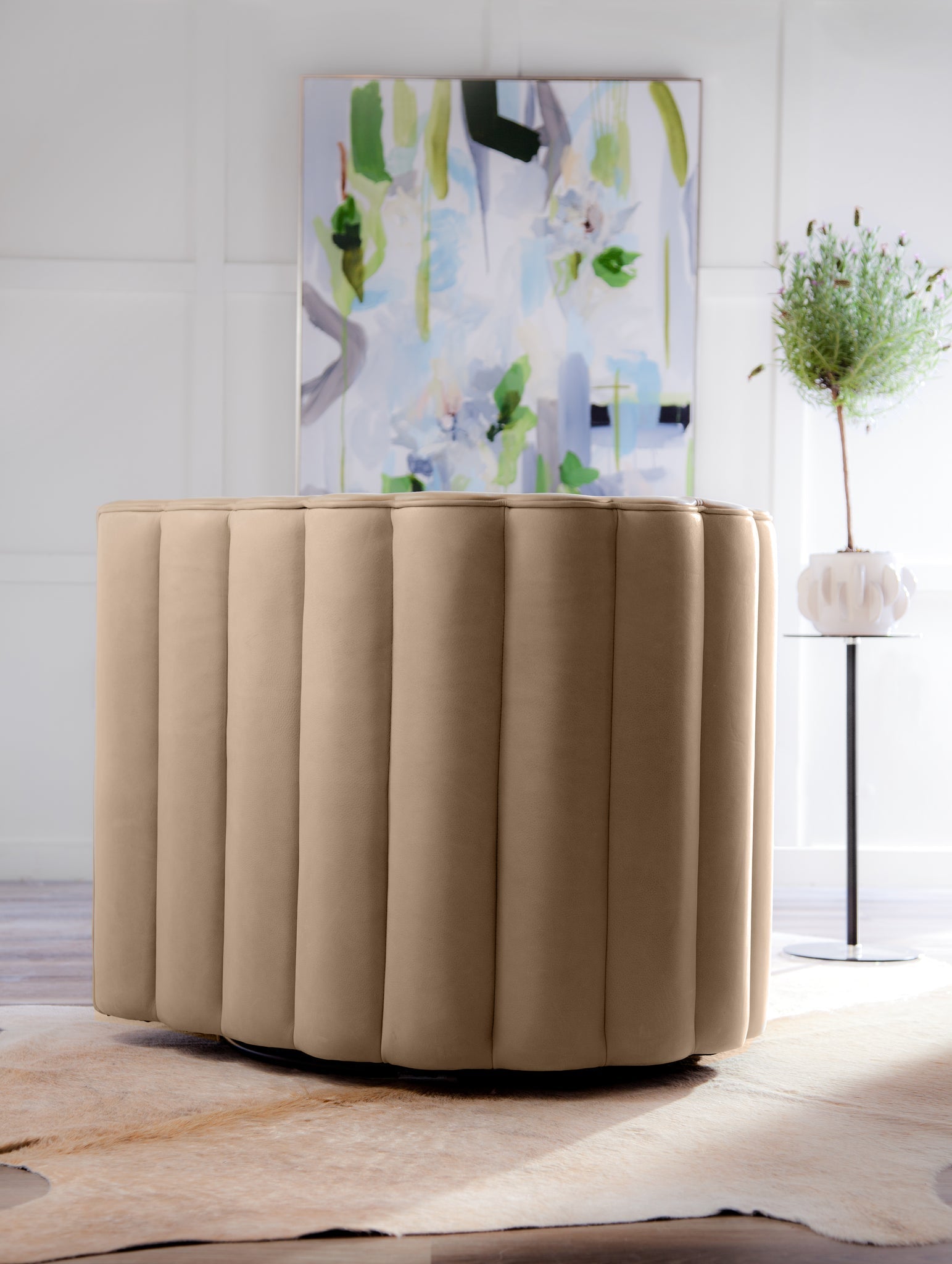 Designed with functionality in mind, the chair's swivel base allows for effortless mobility, giving you the freedom to turn and adjust with ease. The modern cylindrical shape, along with vertical stitch detailing on the Selena Oat finish and tufted design on the Selena Storm finish, adds style and visual interest to this piece. The foam and feather seat construction ensures a plush and comfortable experience, while the sturdy wood elements guarantee long-lasting durability.