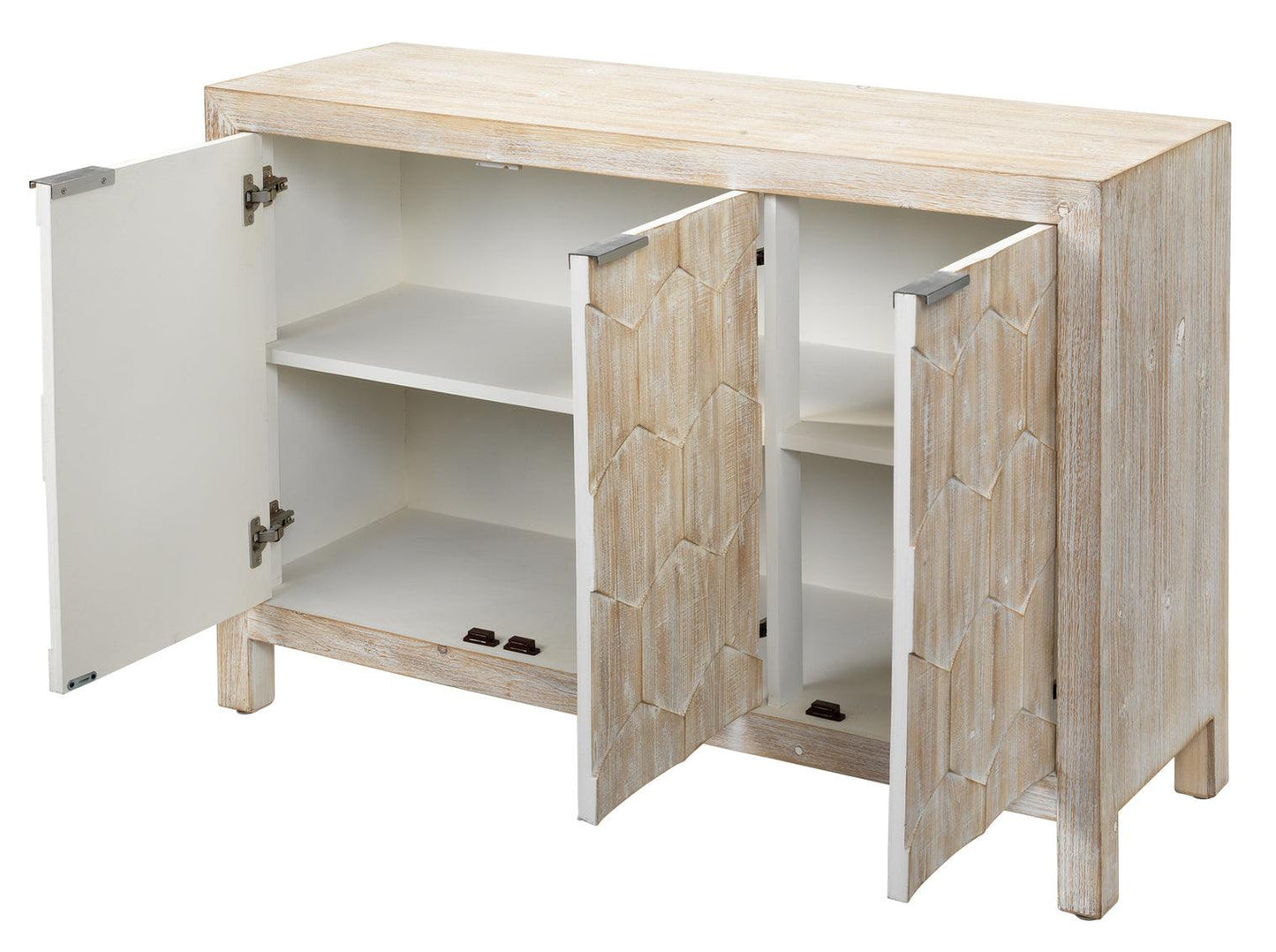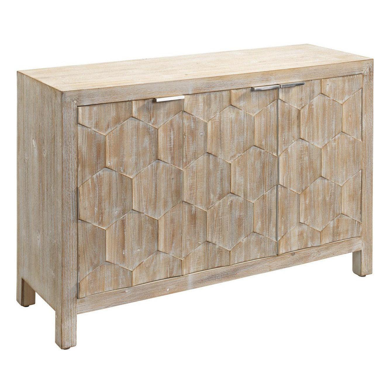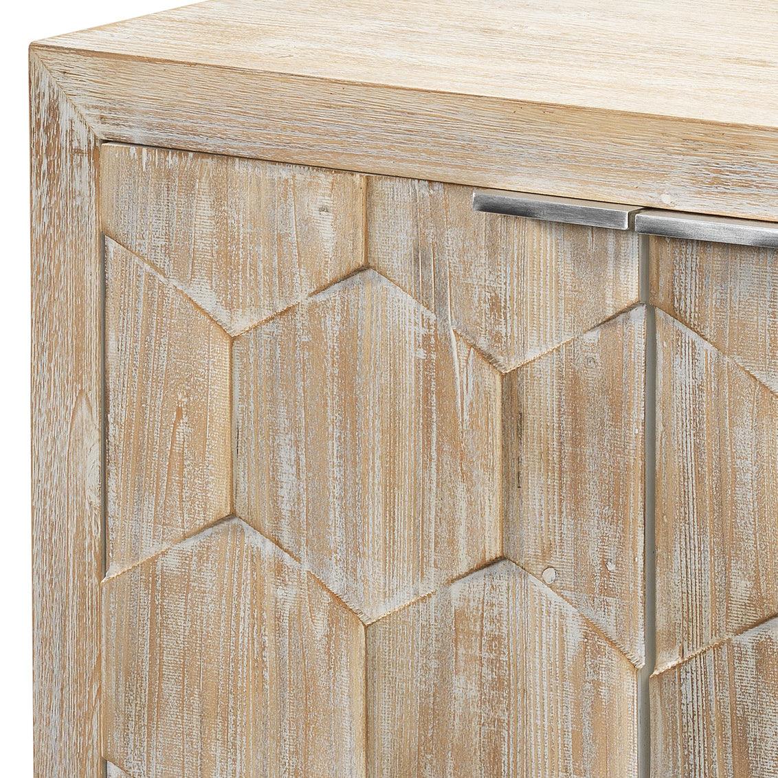 Constructed with fir and MDF, the Juniper accent cabinet offers ample storage space and showcases a repeating hexagonal pattern on its three doors. The hand-applied grey washed finish adds a unique touch while the brushed metal hardware provides a touch of sophistication. Handcrafted and thoughtfully designed, this cabinet is both practical and aesthetically pleasing. Its three doors open to reveal spacious interior storage and a fixed shelf. The doors themselves feature a repeating hexagonal pattern, brushed metal hardware, and a soft gray washed finish. Each piece is skillfully crafted from fir and MDF, with slight variations in wood grain and hand-applied finish for a one-of-a-kind look. Expertly designed with fir and MDF, this cabinet offers generous interior storage and showcases a repeating hexagonal pattern on its three doors, enhanced by the unique brushstrokes and subtle gray washed finish.