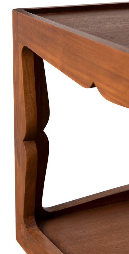The Kabbal Side Table is a stunning addition to any room, offering a blend of modern style and timeless craftsmanship. Made from solid teak, it not only promises durability but also showcases the natural beauty of the wood. The table features a clear coat flat finish, highlighting the rich, warm tones of the teak and enhancing the overall aesthetic appeal. Its simple yet elegant design makes it a versatile piece that can complement a wide range of interior styles, from contemporary to traditional. This wooden table stands out with its open sides and decorative cutouts, adding a touch of sophistication and uniqueness to your space.