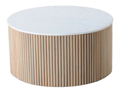 The Trivana White Marble Top Coffee Table brings a touch of modern elegance to your living space with its sleek, round design. The white marble top offers a luxurious surface that complements the natural wood base. This harmonious combination of materials adds a sophisticated look that fits seamlessly into any décor. With its neutral tones, this table serves as a versatile piece that can enhance both contemporary and traditional settings. Crafted with attention to detail, the coffee table features a sturdy wood base with vertical slats that provide stability and visual interest. The table's design emphasizes both form and function, making it a practical addition to any living room.