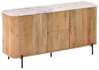 The Karlen Marble Top Sideboard brings a touch of elegance to any modern home. Its standout feature is the smooth white marble top, which adds a luxurious feel to the living space. The light brown wooden body is designed with a ribbed texture, providing a unique visual appeal that complements the marble top. This sideboard is not only stylish but also functional, offering ample storage space for your belongings. The gold handles add a hint of sophistication, making it an ideal choice for those who appreciate fine details in their furniture.