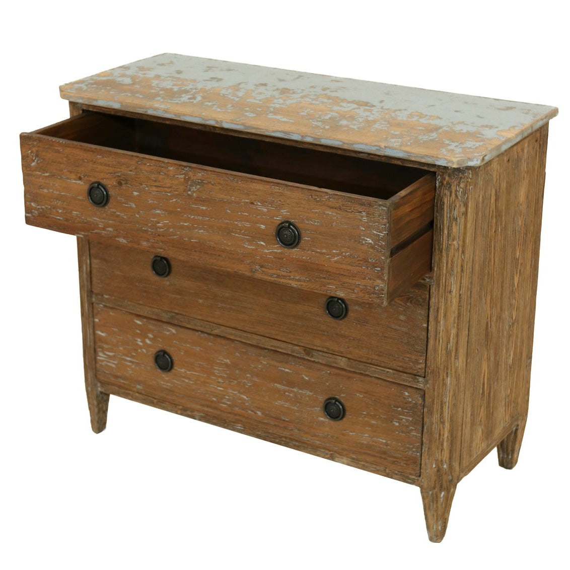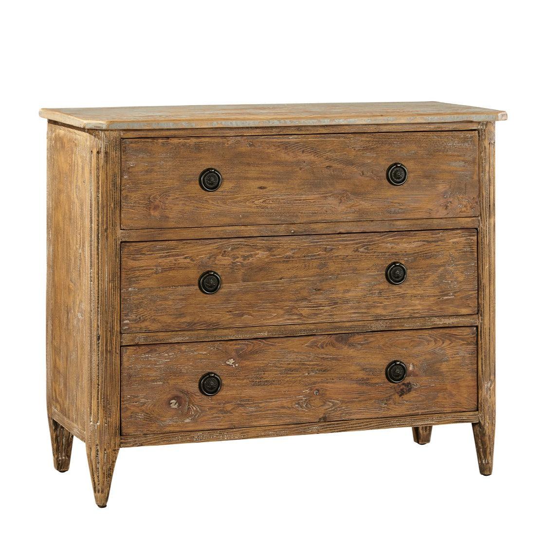 Take a risk and embrace the challenge presented by the Keaton Chest! With a rubbed natural finish, this reclaimed pine chest features clipped corners, fluting, and tapered legs, all adding to its distinctive character. The classic rosette pulls add a strong and bold touch to this inspiring piece.