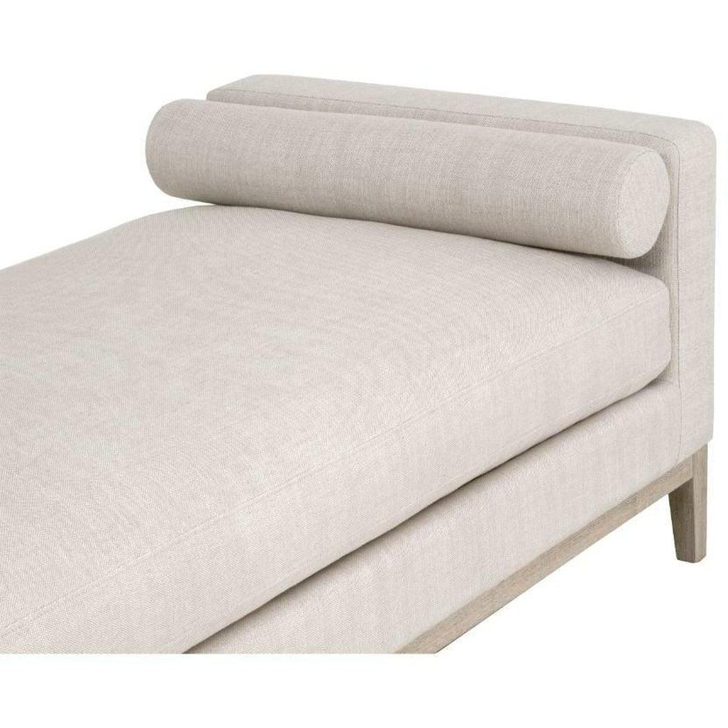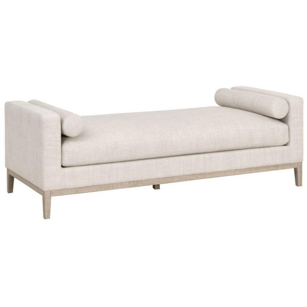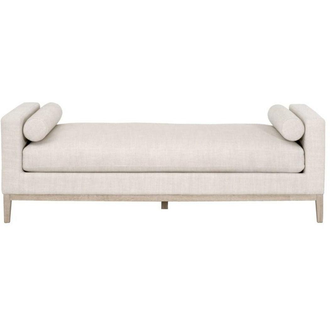 Experience unparalleled luxury and comfort with this exquisite Cream Upholstered Chaise Lounge. Handcrafted with natural materials and featuring a solid oak frame, it offers a unique and sophisticated touch to any bedroom or living room. Its sleek, modern lines and exposed wood base showcase elegance and versatility, making it equally perfect as a daybed or bench. Complete with two round bolster pillows, this piece is the epitome of stylish and comfortable design. Each fabric finish reflects variations that add a touch of artistic flair, making this chaise lounge a must-have for any discerning buyer. Indulge in the ultimate combination of style and comfort with this premier Cream Upholstered Chaise Lounge.
