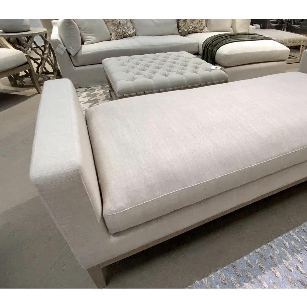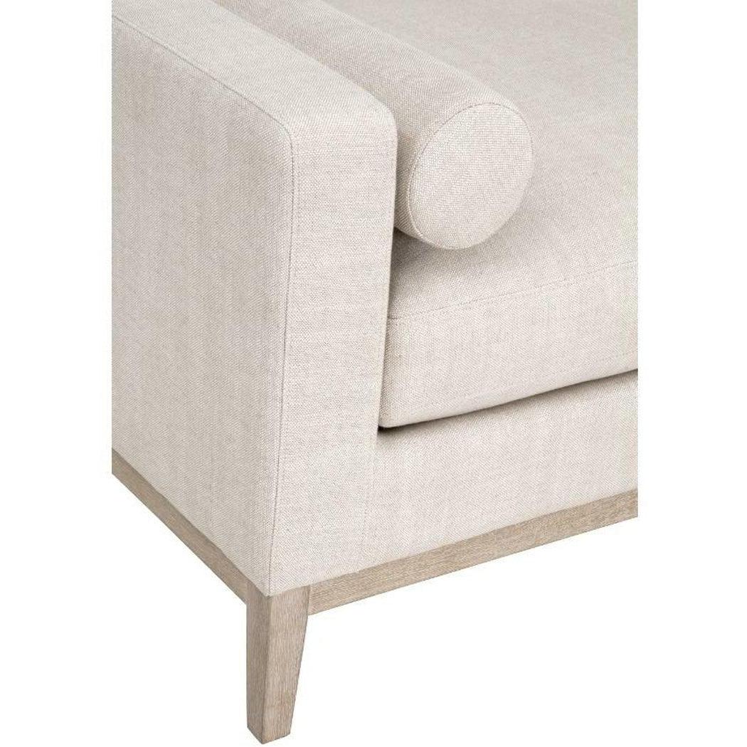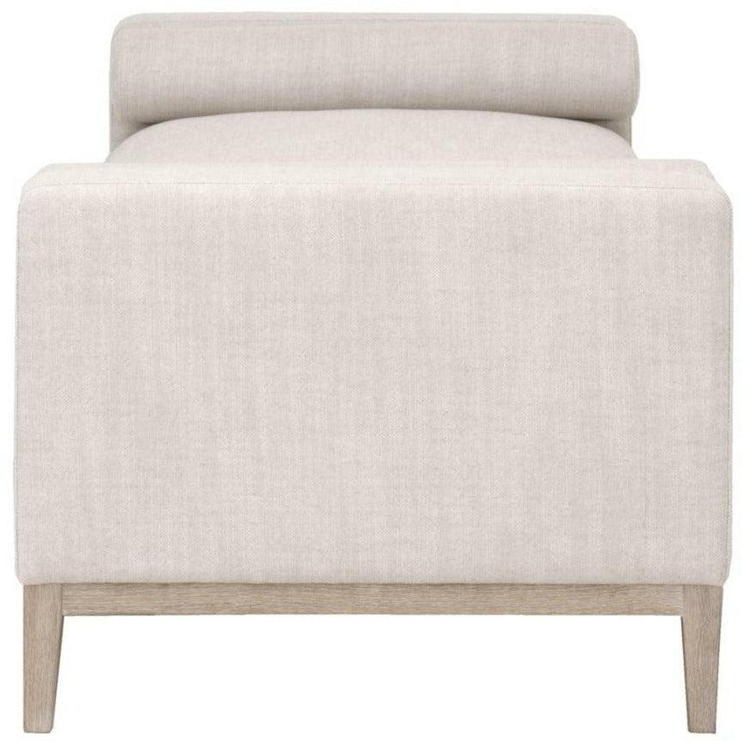 Experience unparalleled luxury and comfort with this exquisite Cream Upholstered Chaise Lounge. Handcrafted with natural materials and featuring a solid oak frame, it offers a unique and sophisticated touch to any bedroom or living room. Its sleek, modern lines and exposed wood base showcase elegance and versatility, making it equally perfect as a daybed or bench. Complete with two round bolster pillows, this piece is the epitome of stylish and comfortable design. Each fabric finish reflects variations that add a touch of artistic flair, making this chaise lounge a must-have for any discerning buyer. Indulge in the ultimate combination of style and comfort with this premier Cream Upholstered Chaise Lounge.