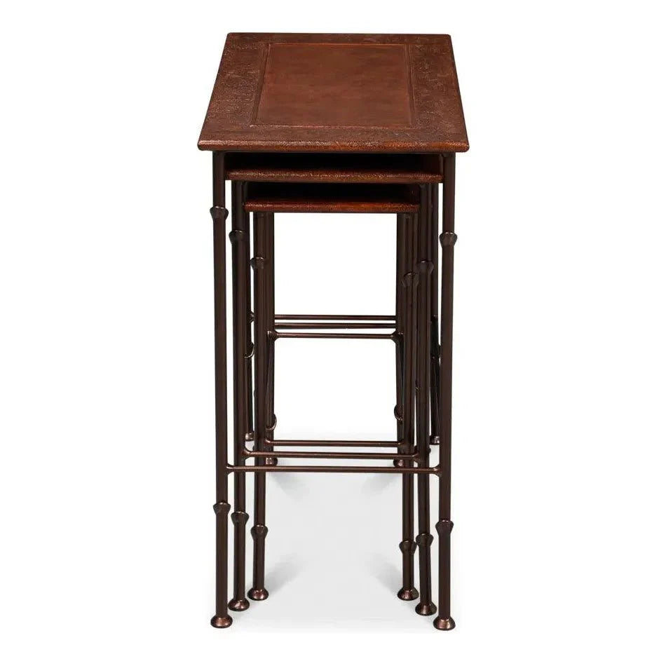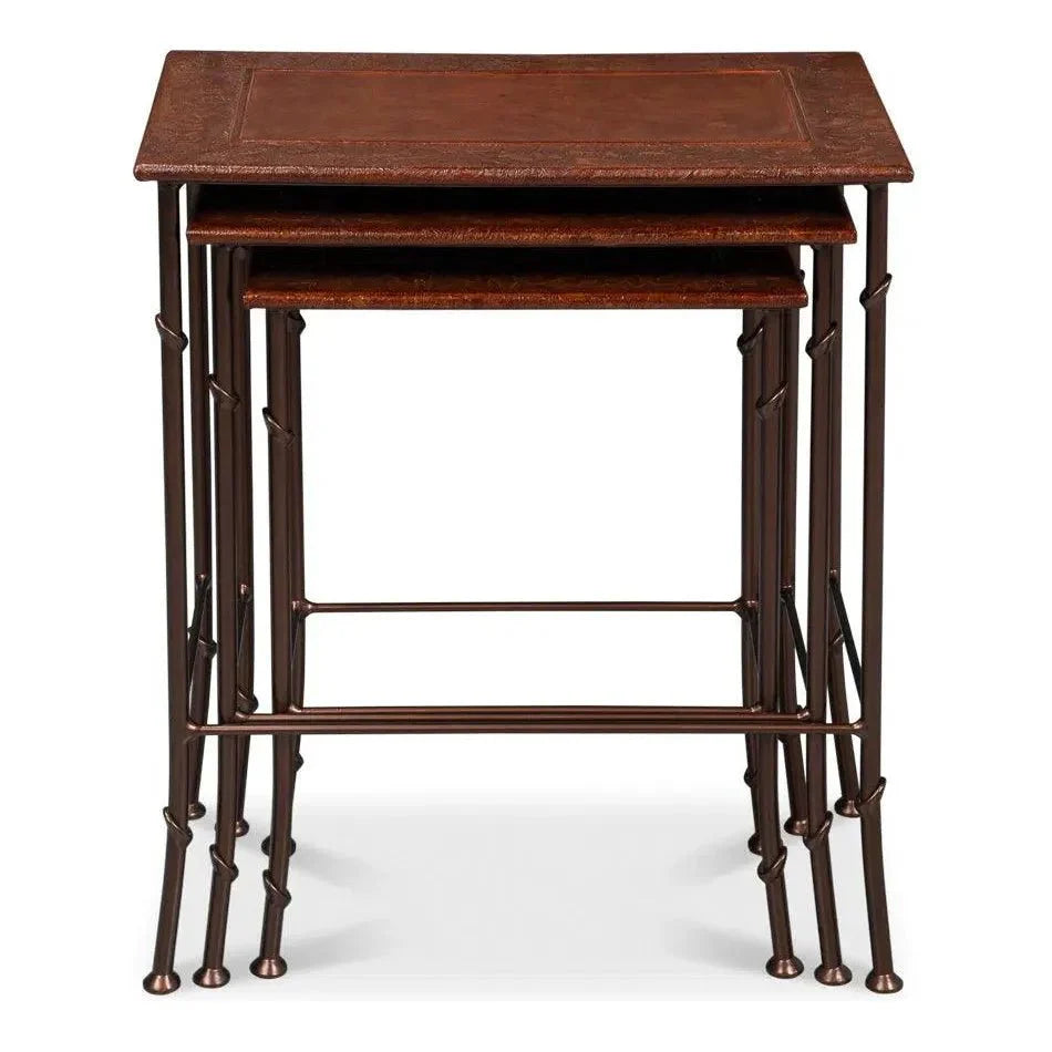 Sold as a set of three, this nesting trio is a bold and refined addition to any living area. Not only visually stunning, these tables provide practical functionality. With their blend of bamboo and cast iron, they create a sophisticated Victorian look. The touch of luxury from the genuine leather tops and timeless elegance of the aged iron frames make this set a must-have for those who like to take risks!