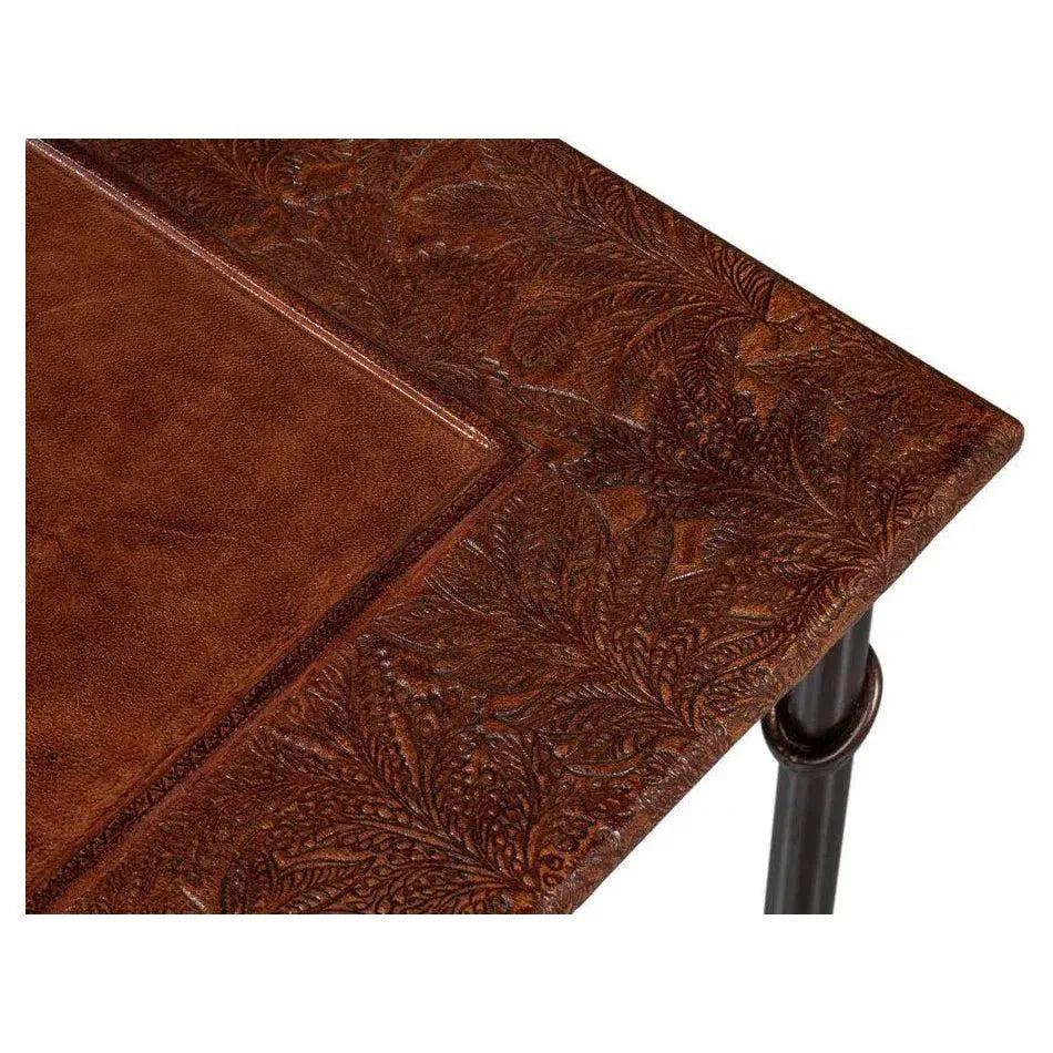 Take a daring leap with the Kew Gardens Leather Nesting Tables! This trifecta of nesting side tables, combining rich leather, elegant bamboo designs, and cast iron, will add an element of adventure to your living space. Each table features a genuine leather-inlaid top with contrast stitching, while the aged iron frames boast an antiqued brass finish and exotic bamboo motif legs. Separately, these tables offer varying heights and ample surface space.