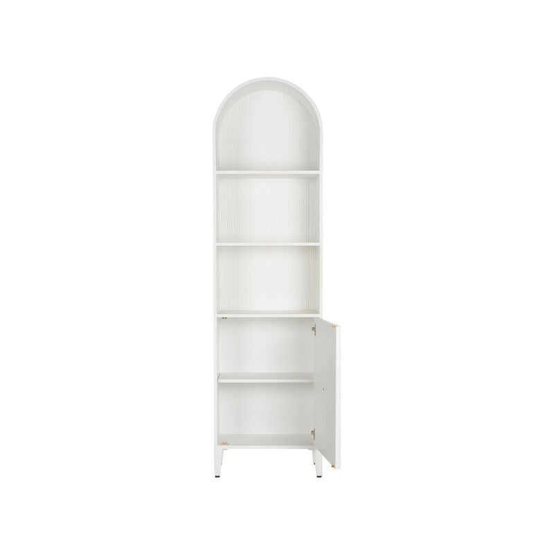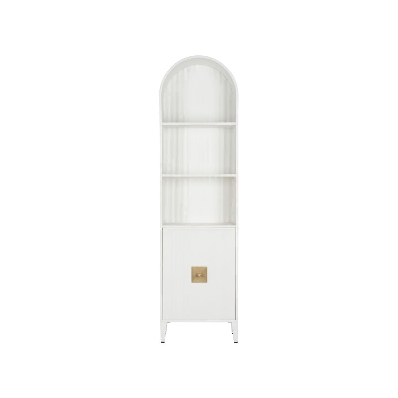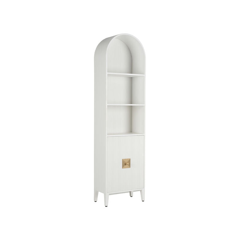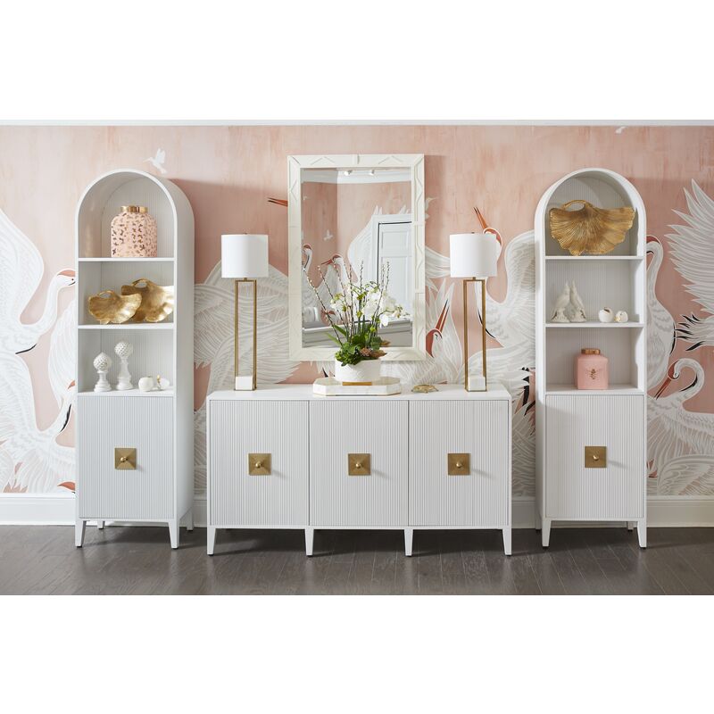The King Tower Cabinet is a versatile storage solution that blends seamlessly with any home decor. Whether used to showcase your prized china, store delicate linens, or as an elegant bar cabinet, this piece offers both style and functionality. The cabinet is designed by Elizabeth Wicker and is part of the renowned Chelsea House collection. Its glossy white finish is complemented by reeded wood detailing and aged bass hardware, adding a touch of understated luxury to your space. This cabinet features a tall, elegant design with an arched top, providing a sophisticated aesthetic. The three open shelves are perfect for displaying decorative items, while the enclosed cabinet offers additional storage, complete with a gold square handle that adds a touch of elegance.