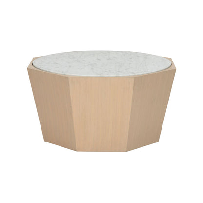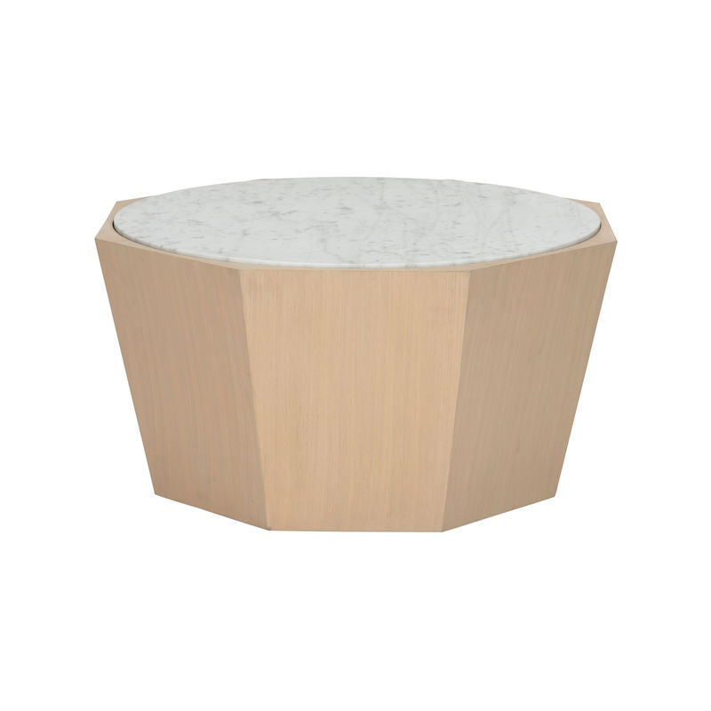 The Laurence Coffee Table combines elegance with a modern touch. This table features a stunning insert of honed Carrera marble, which adds a layer of sophistication to any living space. Its sculptural base, crafted from rift-cut white oak, provides a sturdy foundation with a luxurious feel. The faceted design of the table's body enhances its visual appeal, making it a standout piece in any room. The natural tones of white and cream seamlessly blend together, allowing for versatile styling options. This coffee table is more than just a functional piece; it transforms the atmosphere of your living area. Its design offers a sense of grounded luxury, while the Carrera marble top provides a smooth and elegant surface for displaying decor or serving refreshments.