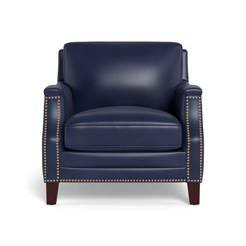 The Leather Club Chair American Crafted Elegance Collection reimagines your living space with its elegant outline. The slim track arm, artfully curved and scooped, is the focal point, adorned with a stylish double row of bronze nail-head accents. This sophisticated embellishment flows seamlessly along the front and outer edges, highlighting the graceful curves that define the "American Crafted Elegance" collection.