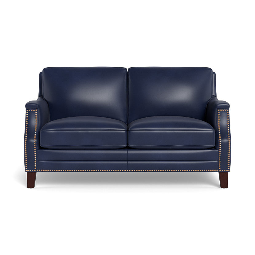 Elevate your living room with the stunning silhouette of the Leather Loveseat American Crafted Elegance Collection. Featuring a sleek track arm, beautifully contoured and embellished with a dual row of bronze nail-head trim, this piece captures attention. The refined curves and intricate detailing continue along the front rail and outer arms, creating a cohesive and sophisticated look for the "American Crafted Elegance" collection. Complete with sleek, dark solid wood tapered feet, this loveseat exudes a chic aesthetic.