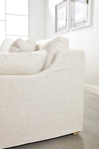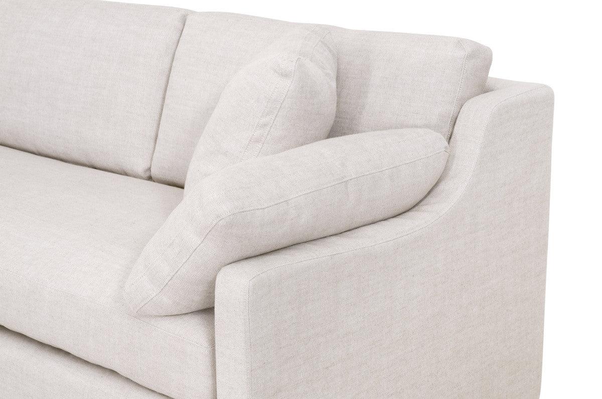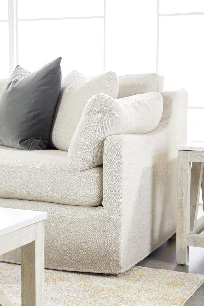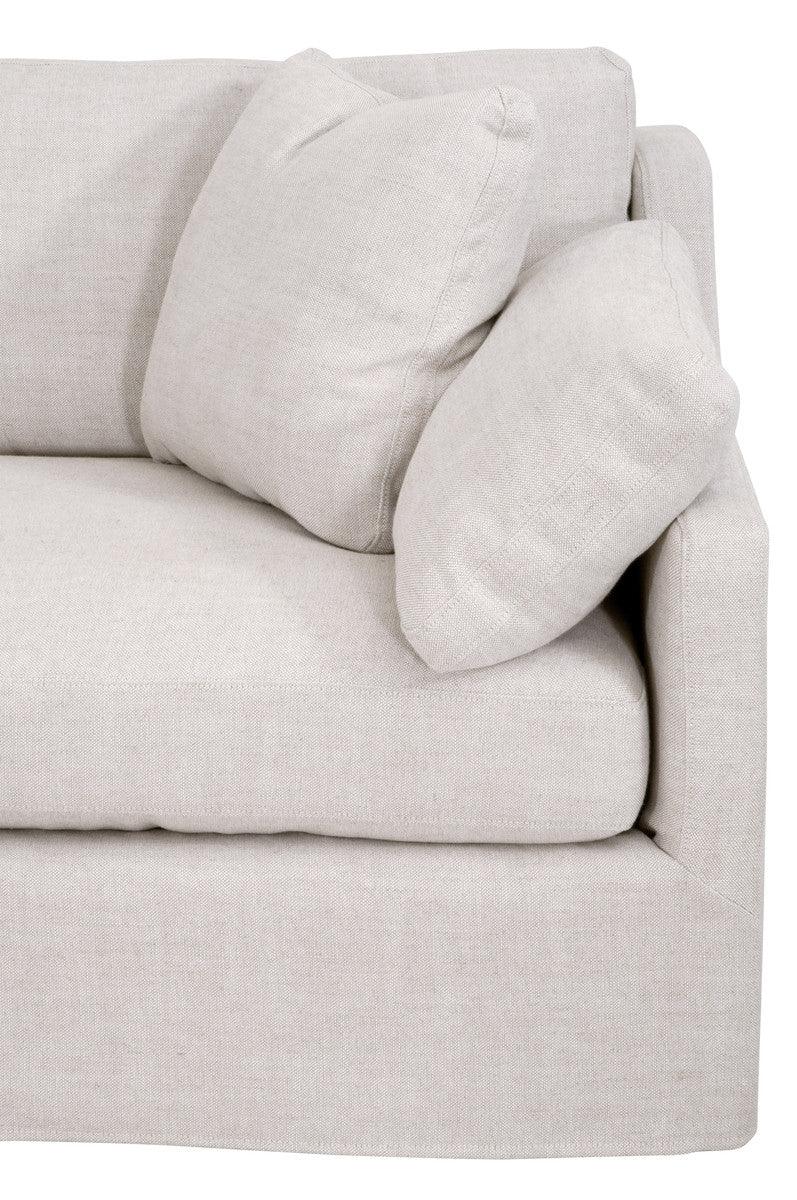 Design your ideal sofa with the Lena Modular Slipcover 2-Seat Right Slope Arm Sofa. Our handcrafted 8-way hand tied suspension and poly/down blend cushions offer unparalleled comfort. Each piece features an undermount metal snap to prevent sliding and gaps, while the neutral yet sophisticated bisque-colored fabric effortlessly blends with any decor. Embrace the timeless elegance of our natural materials and unique dye lot variations. With the option to purchase each piece separately, you can create a tailor-made sofa to perfectly fit your space. This 2-Seat Right Arm Sofa exudes luxury with its plush cushions and meticulous construction. Elevate your space with the sophisticated touch of this modular sofa. Our exclusive fabric finishes, made with natural materials, add a touch of individuality and quality to this stunning piece.