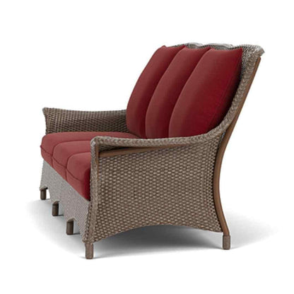 The Mandalay Sofa Premium Wicker Furniture Lloyd Flanders offers a one-of-a-kind five-strand weave that mimics the natural texture of sea grass. Its broad arms and loose back cushions prioritize comfort, while subtle curves encourage relaxation and extended stays. This wicker collection from Lloyd Flanders effortlessly combines style and practicality, transforming your outdoor space into a personal getaway from the daily grind. It's suitable for a lanai, sun room, or front lawn, providing versatility that adapts to your lifestyle and accommodates seasonal changes. Showcasing traditional American craftsmanship, the unique 5-strand wicker weave and distinctive design are sure to impress. Plus, the wicker is resistant to cracking and peeling, and can be customized with a variety of color options. With 20 rust-resistant finishes and a vast selection of fade-resistant, mildew-resistant, and water-repellent fabrics, you can create your perfect patio furniture set. Not to mention, this furniture offers exceptional comfort and durability