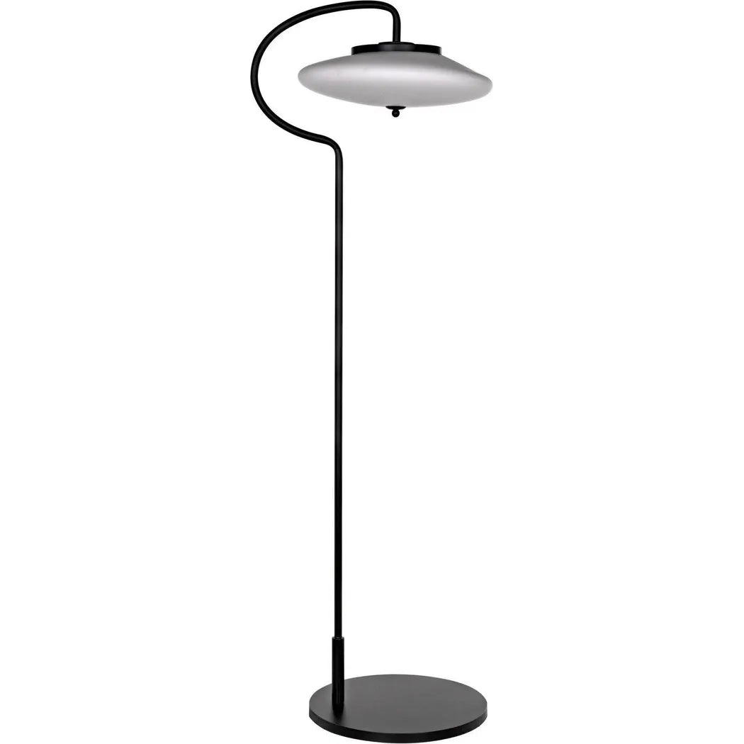 Introducing our Lolibri Floor Lamp - a sleek and modern lighting option with an industrial steel body finished in black. The sturdy disc base and crook top stem provide reliable support, while the elegant white glass spheroid saucer shade adds a touch of sophistication to any room. Elevate your space with our Lolibri Floor Lamp. Our Lolibri floor lamp has an industrial steel body finished in black, with a large disc base, crook top stem, and white glass spheroid saucer shade. Our Lolibri floor lamp boasts an industrial steel design with a sleek black finish.