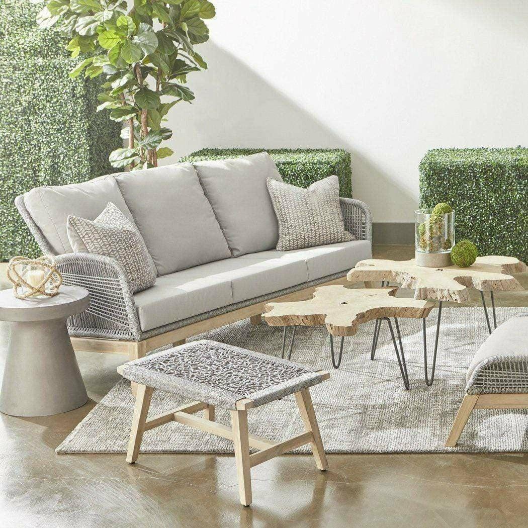 Experience the luxury and sophistication of the Loom Outdoor 79" Sofa. Combining coastal style with durability, this stunning piece features a sturdy aluminum frame, solid teak legs in a beautiful wood grain finish, and a unique loom design of platinum-colored rope. With removable all-weather cushions, this sofa offers both comfort and elegance for any outdoor lounging area. Add a touch of coastal style to your backyard or patio with this exquisite woven outdoor sofa. Meticulously constructed with an aluminum frame and solid teak legs, this sofa is not only sturdy but also durable for outdoor use. The tightly woven platinum-colored rope creates a distinctive loom design, complementing the elegant gray teak legs' wood grain finish.