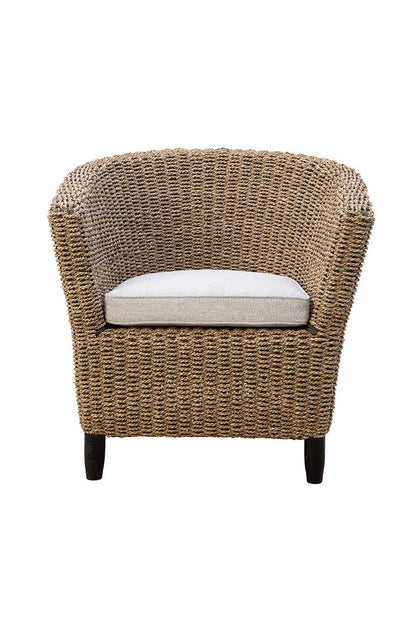The Loren Chair blends natural beauty with durability and comfort. Its solid wood frame is expertly wrapped in two-toned woven banana leaf, creating a stunning visual texture that catches the eye. This chair is topped with a performance linen cushion, ensuring that it is as comfortable as it is stylish. Whether used as an occasional chair or a focal point in your living space, the Loren Chair brings a natural and inviting touch to any room.