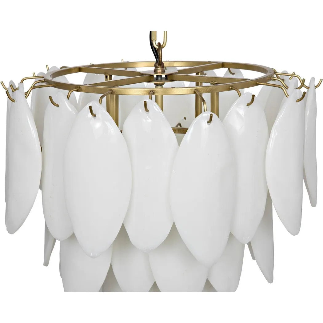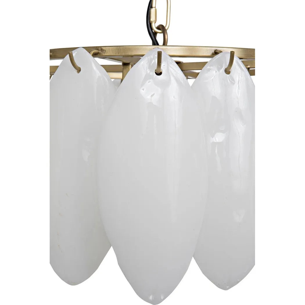 Illuminate your space with the elegant and luxurious Lotus Metal and Glass Chandelier. Featuring three tiers of handcrafted glass petals and a hand finished metal frame in antique brass, this chandelier adds a touch of old-world charm to any room. Elevate your decor with the Lotus Chandelier today. Three tiers of handcrafted glass petals drape the gorgeous Lotus chandelier. For an added touch of luxe, the metal frame is hand finished in antique brass. Illuminate your space in style with Lotus Metal and Glass Chandelier. With three tiers of handcrafted glass petals and a hand finished metal frame, this chandelier exudes elegance and luxury.