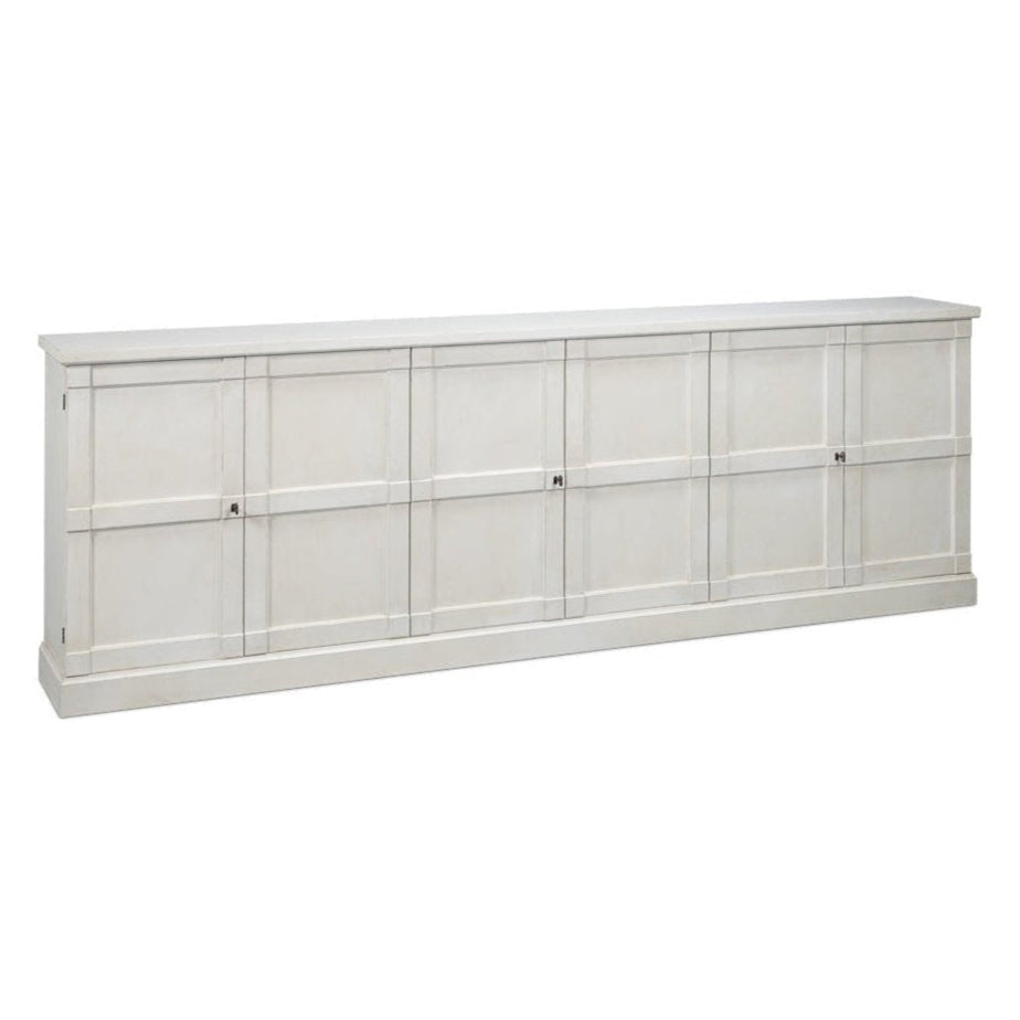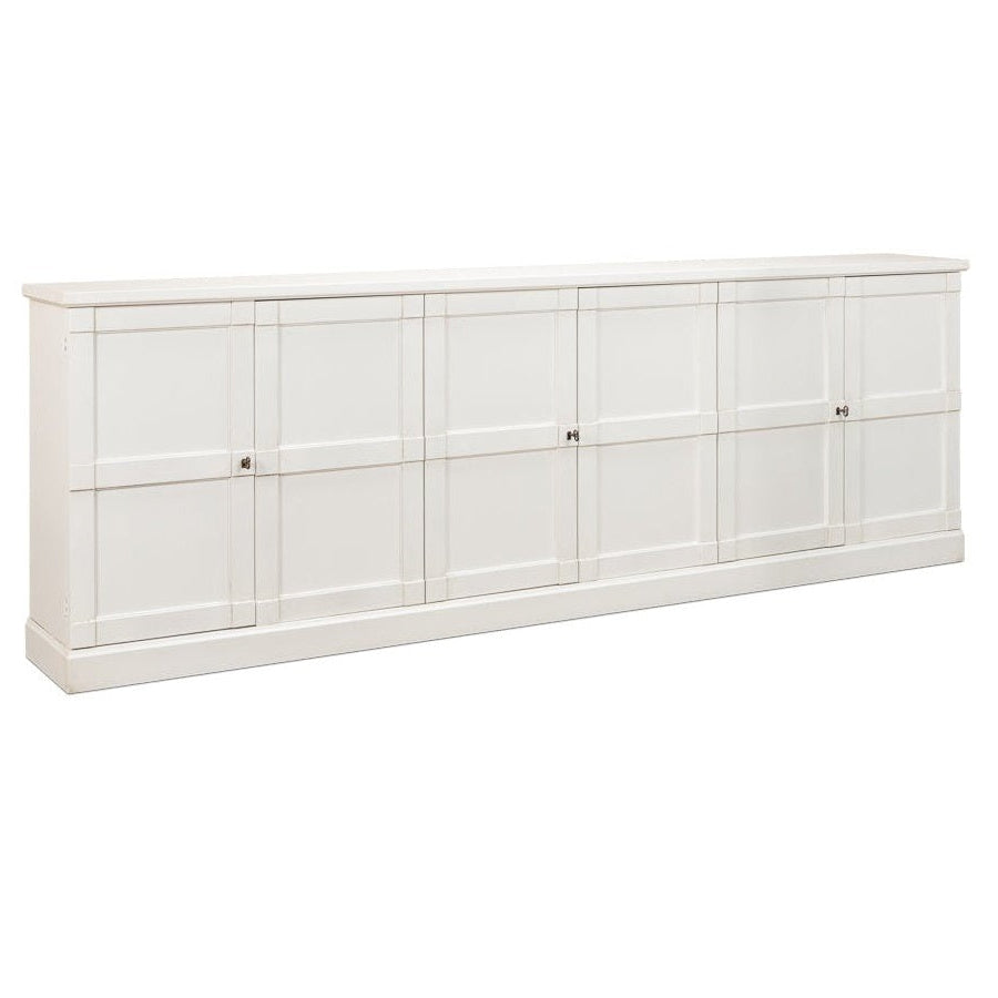 Measuring generously in width, this Sideboard offers ample storage without overwhelming your space. Behind the six doors, you'll find spacious compartments perfect for organizing dinnerware, linens, or other essentials. The sturdy wooden construction ensures lasting durability, making it a reliable piece for years to come. This rectangular sideboard's stucco white-cortina white-sage-grey color complements the elegant finish, offering a subtle contrast that adds depth to its appearance.
