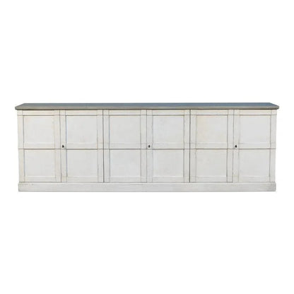 The Luciana Wood Doors Buffet 112" St. with Grey effortlessly combines elegance and sustainability. Expertly hand-distressed from recycled wood, each unique piece displays authentic imperfections from its prior life. A stucco white case and contrasting grey granite top add a touch of sophistication to this buffet. Behind six recessed panel doors adorned with bin pulls, you'll find three adjustable shelves, providing ample space to store and display all your dining room essentials and collections. Transform your dining room with this substantial piece, with minimal assembly required.