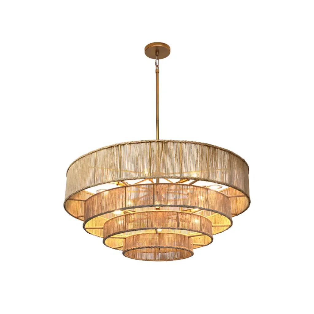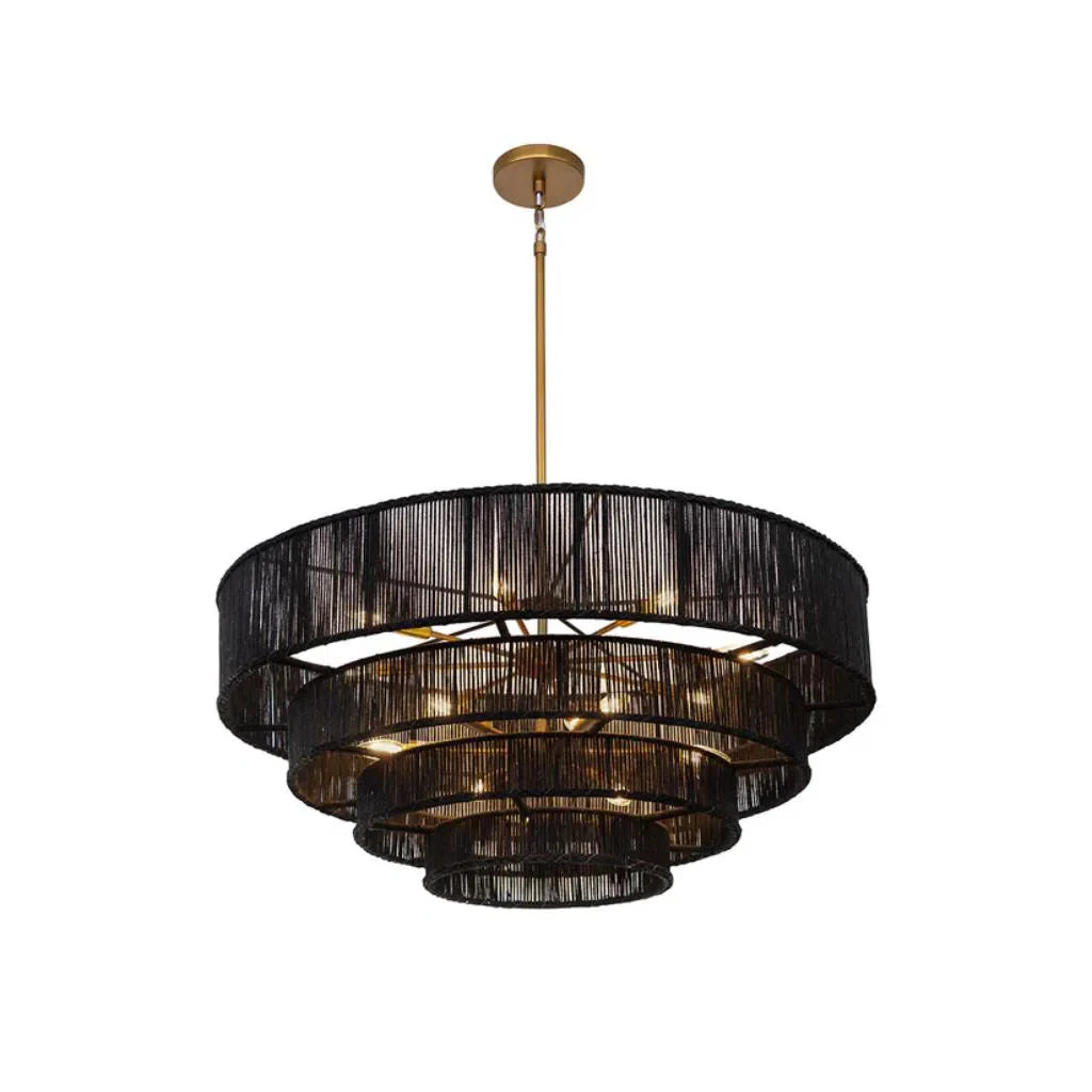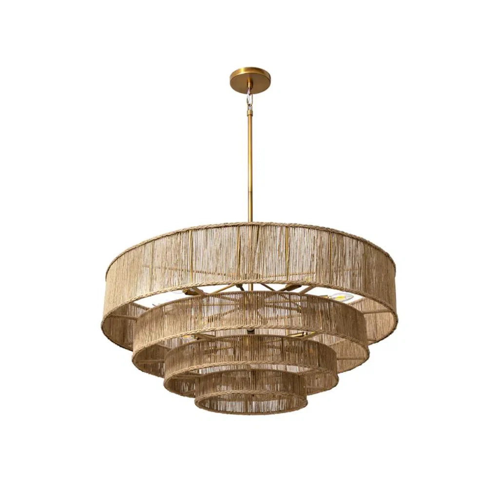 Brimming with rustic allure, the Lumina Chandelier adds a charming flair wherever it is placed. Handcrafted from black jute or natural jute, it features a traditional tiered drum shape. This artisan-crafted piece allows soft light to filter through its open handwoven lines, enhancing the warm, inviting atmosphere of any space.