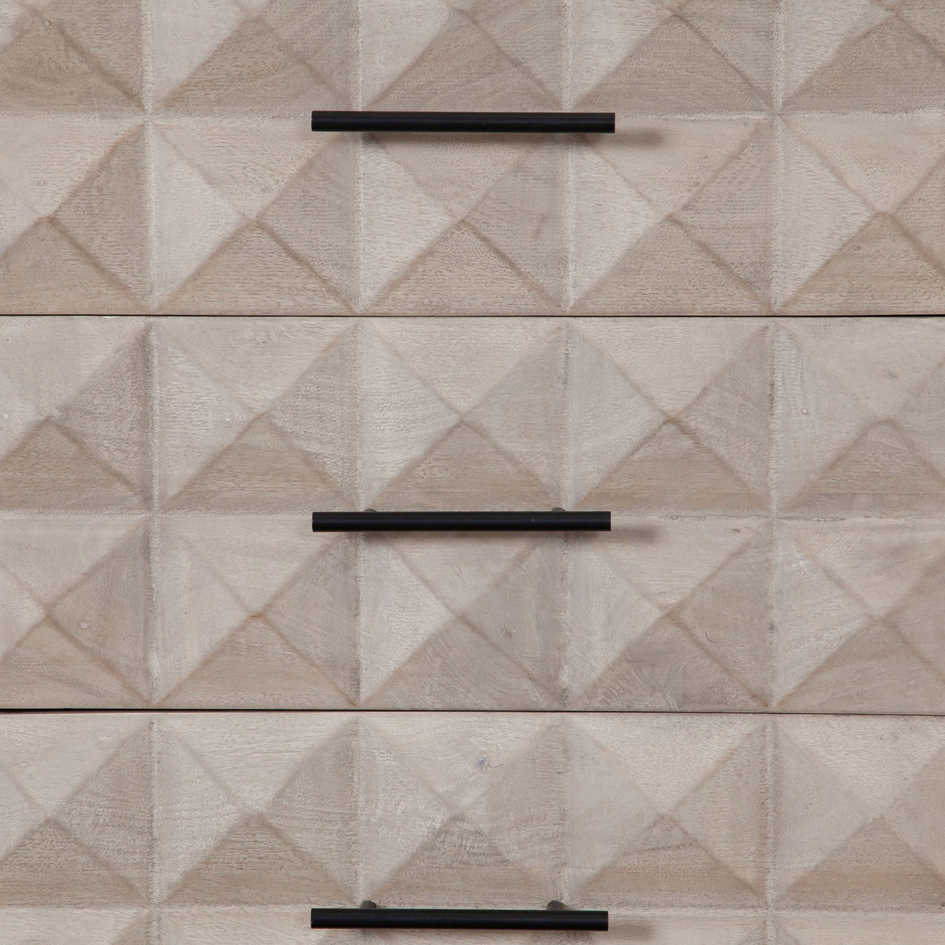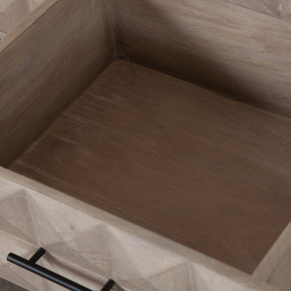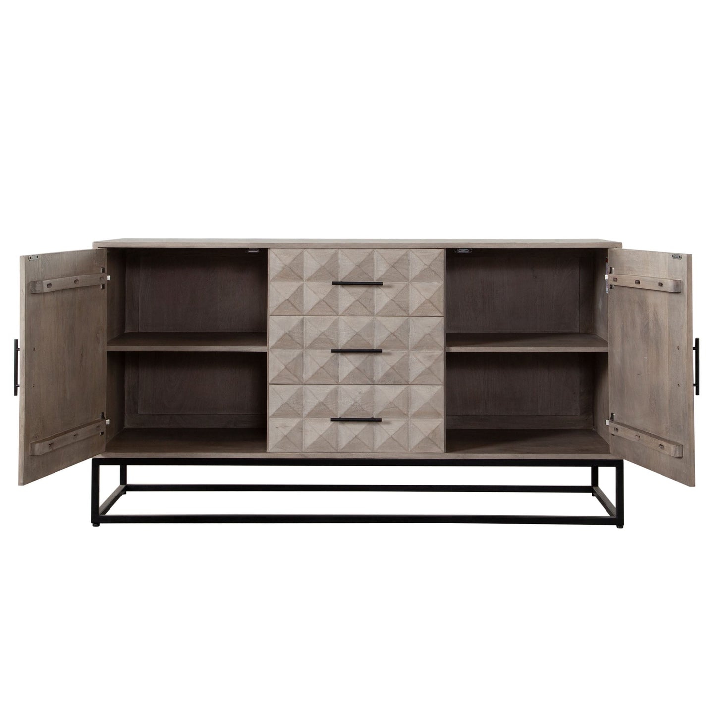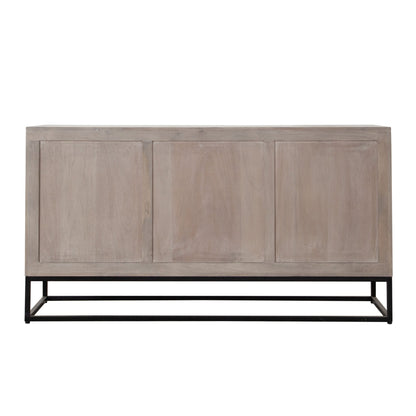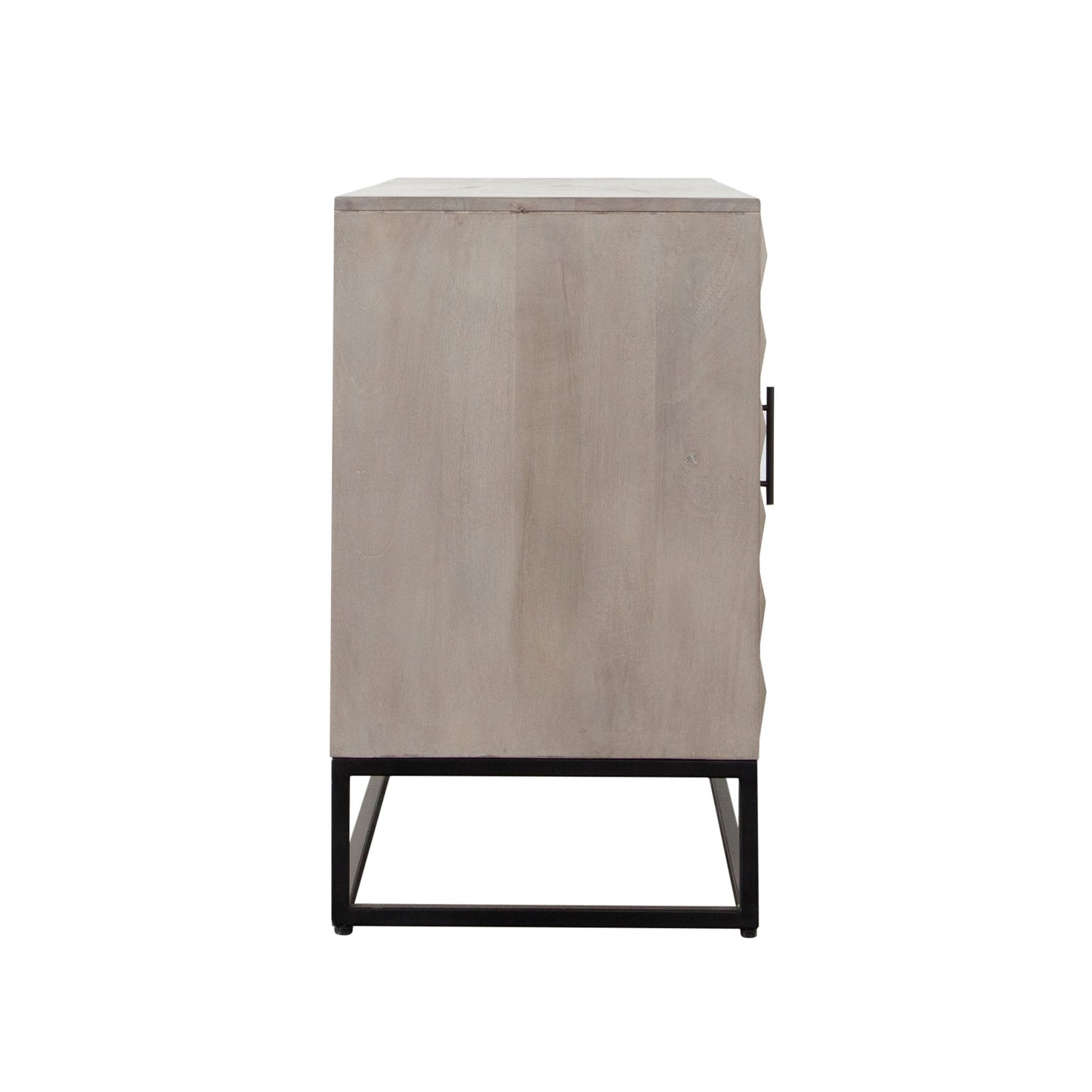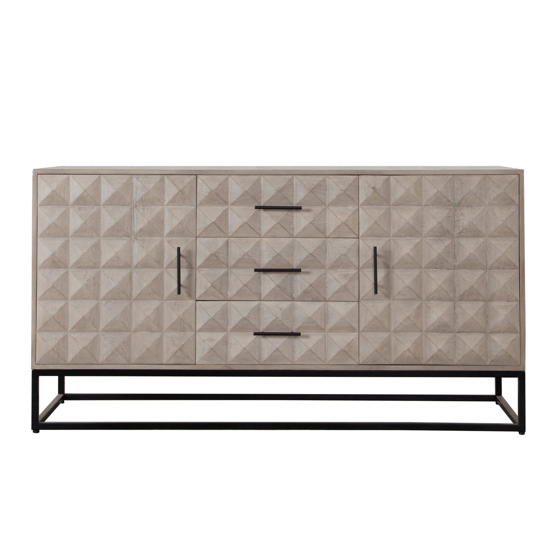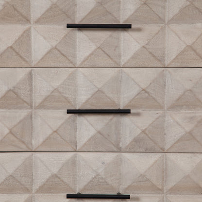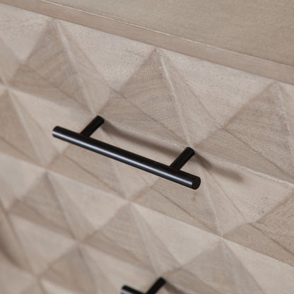 The Madera 3-Drawer/2-Door Solid Wood Dresser offers a perfect blend of style and functionality. Crafted from solid wood, its soft Ashe finish exudes a warm and inviting vibe, making it a great addition to any room. The dresser stands proudly on a sturdy black powder-coated metal base, which adds a modern touch to its design. The intricately carved detail on the drawer fronts enhances the visual appeal, bringing an elegant and artistic element to your space.