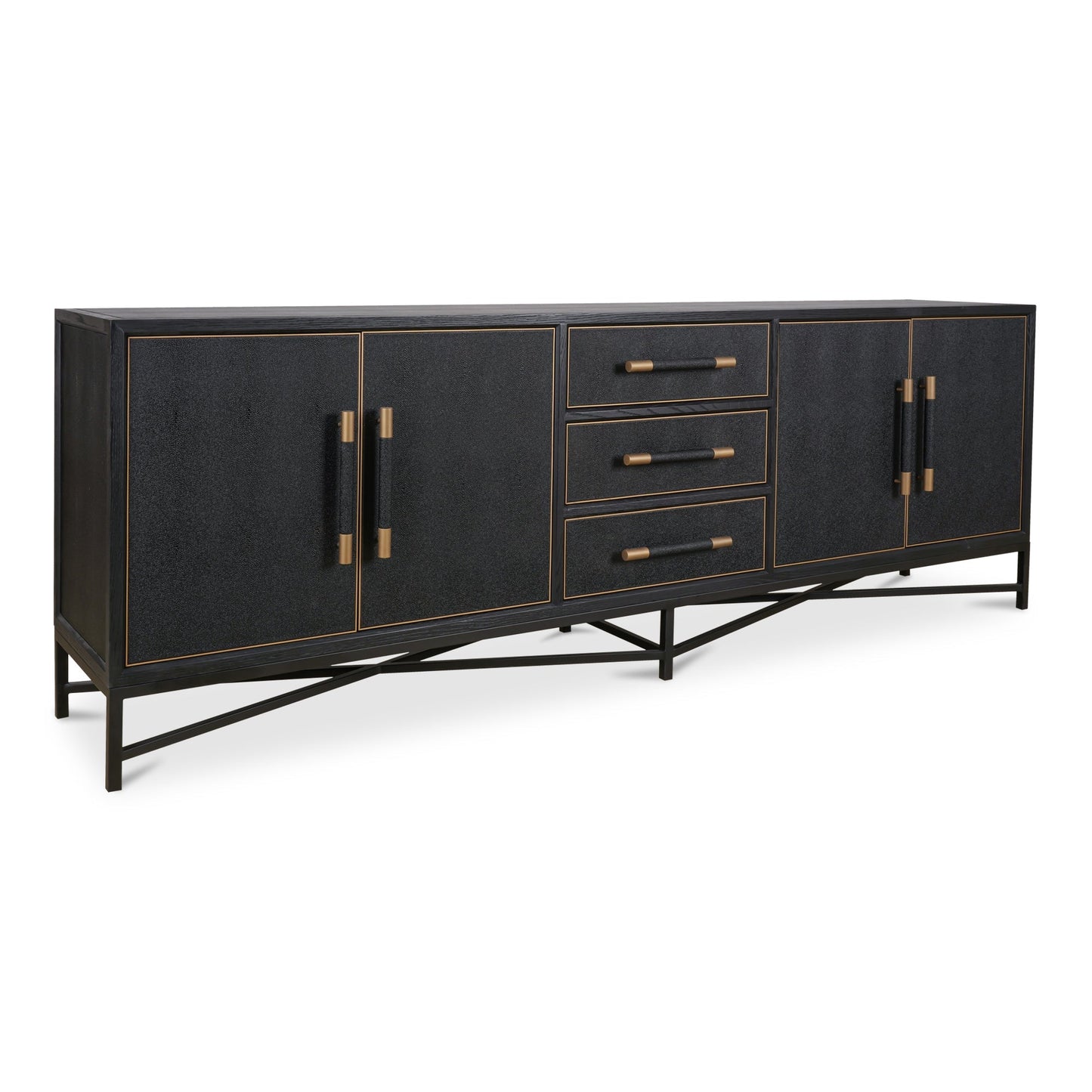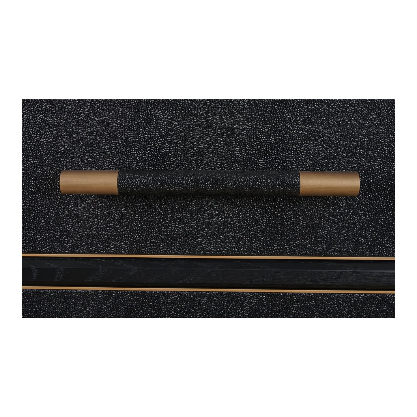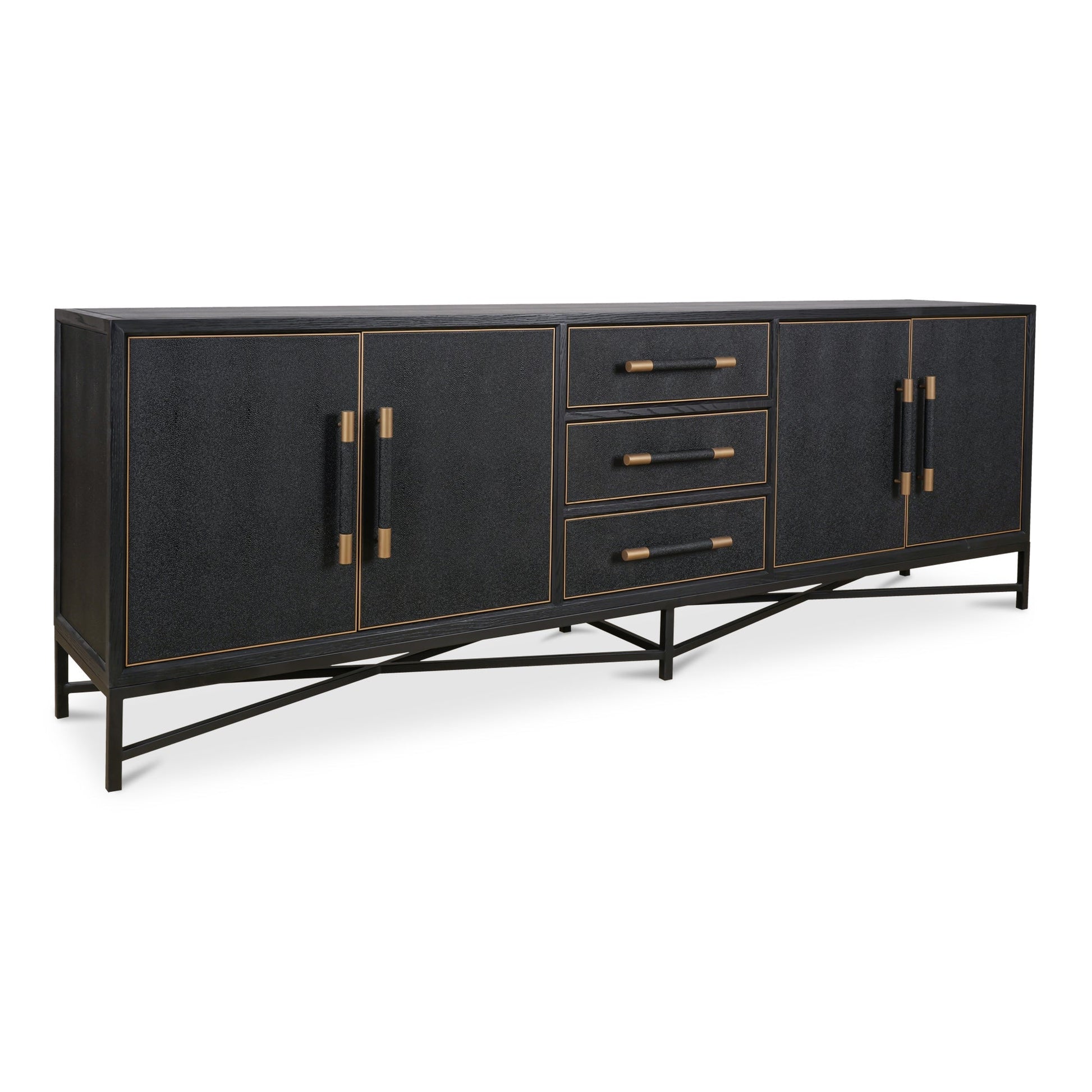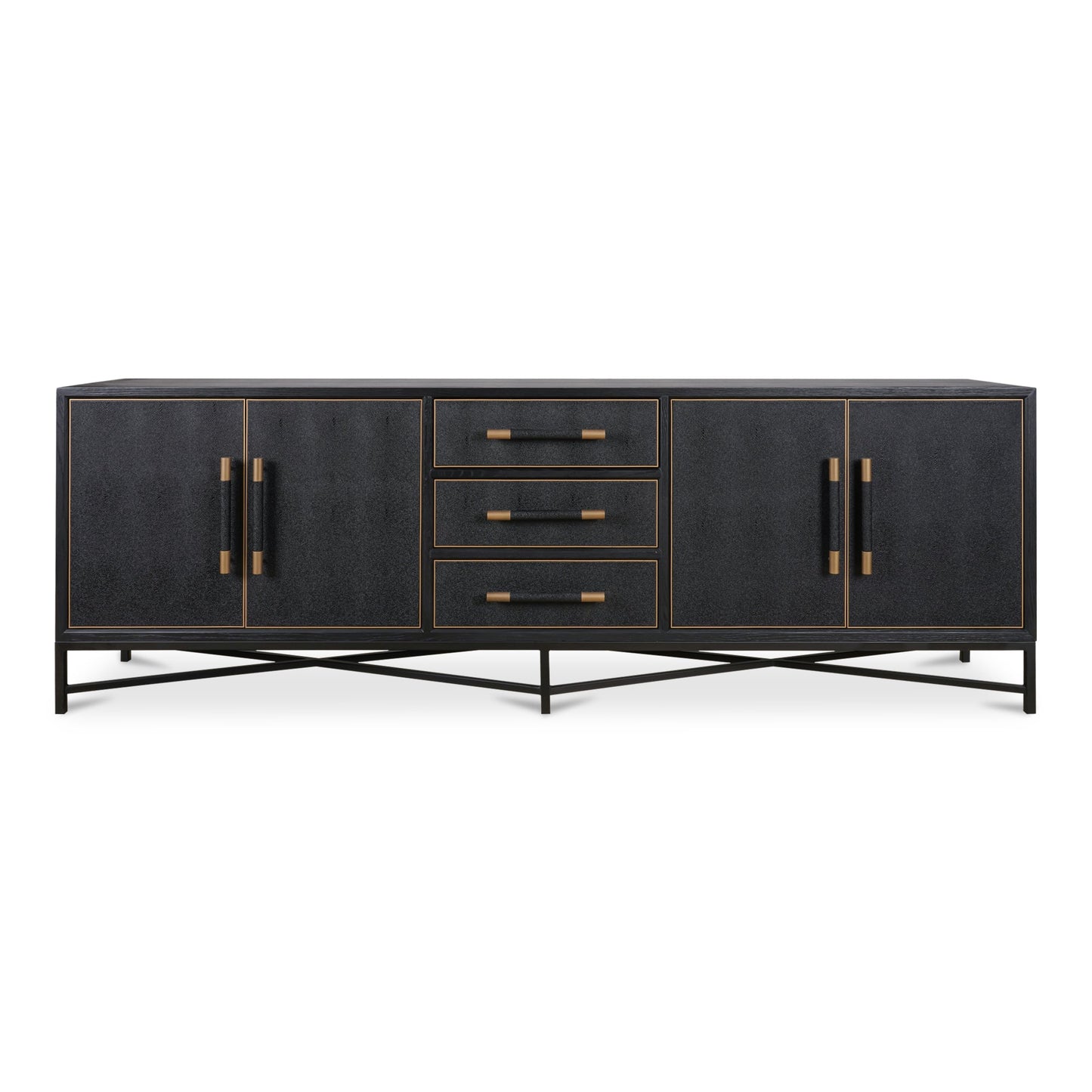 The Mako Sideboard Large Black with Solid Oak Frame brings elegance to any living space with its sleek black oak frame and antique gold-finished detailing. Upholstered in high-quality vegan shagreen leather, it combines visual texture with practicality, providing ample storage space for your essentials. The six spacious, side-mounted drawers ensure easy access and help keep your space tidy, while the solid oak frame guarantees durability and a sophisticated look. This sideboard is not just about style but also convenience. The brass-finished detailing and base add a touch of luxury, making it a standout piece in any room. Designed for ease, the Mako Sideboard requires no assembly, allowing you to enjoy its beauty and functionality immediately.