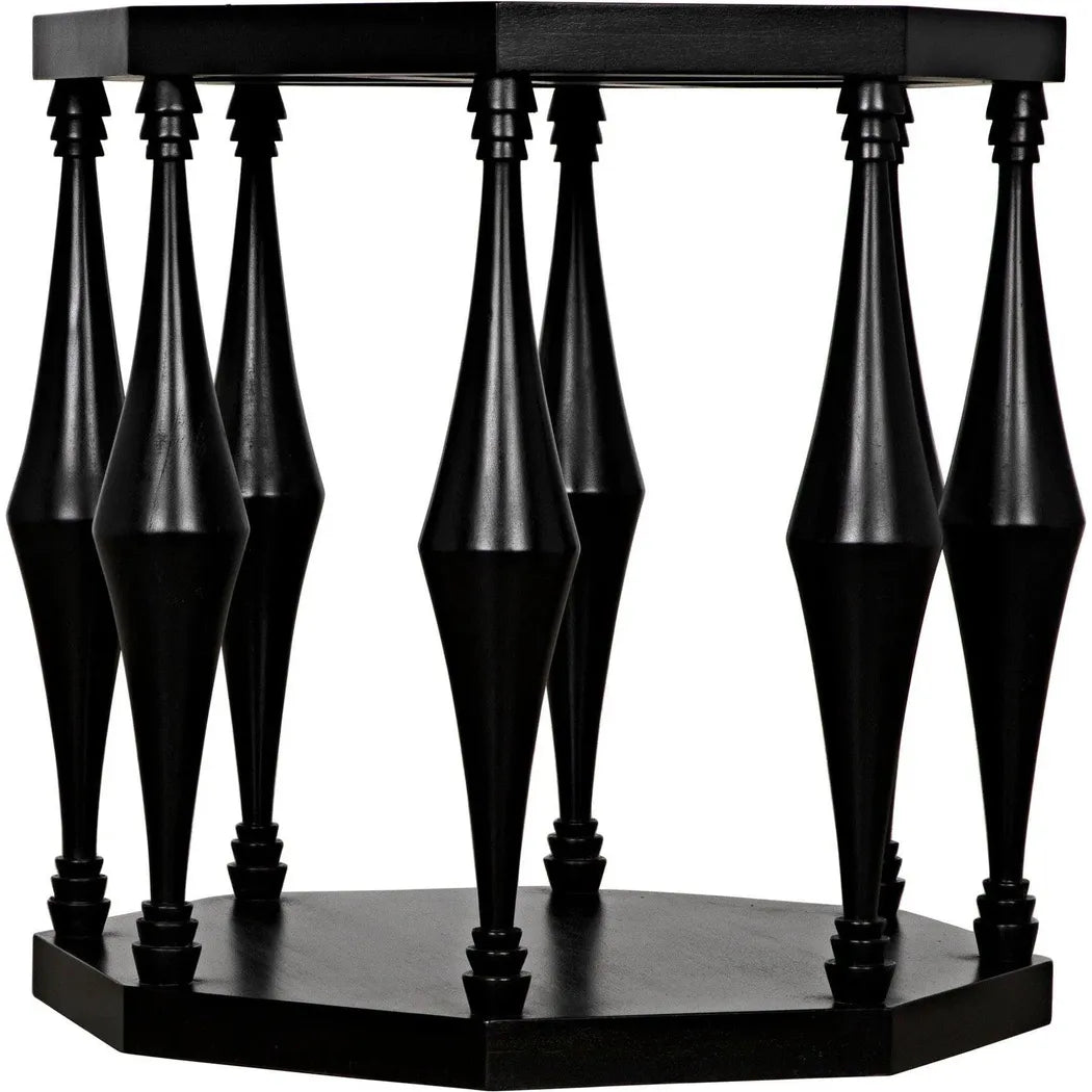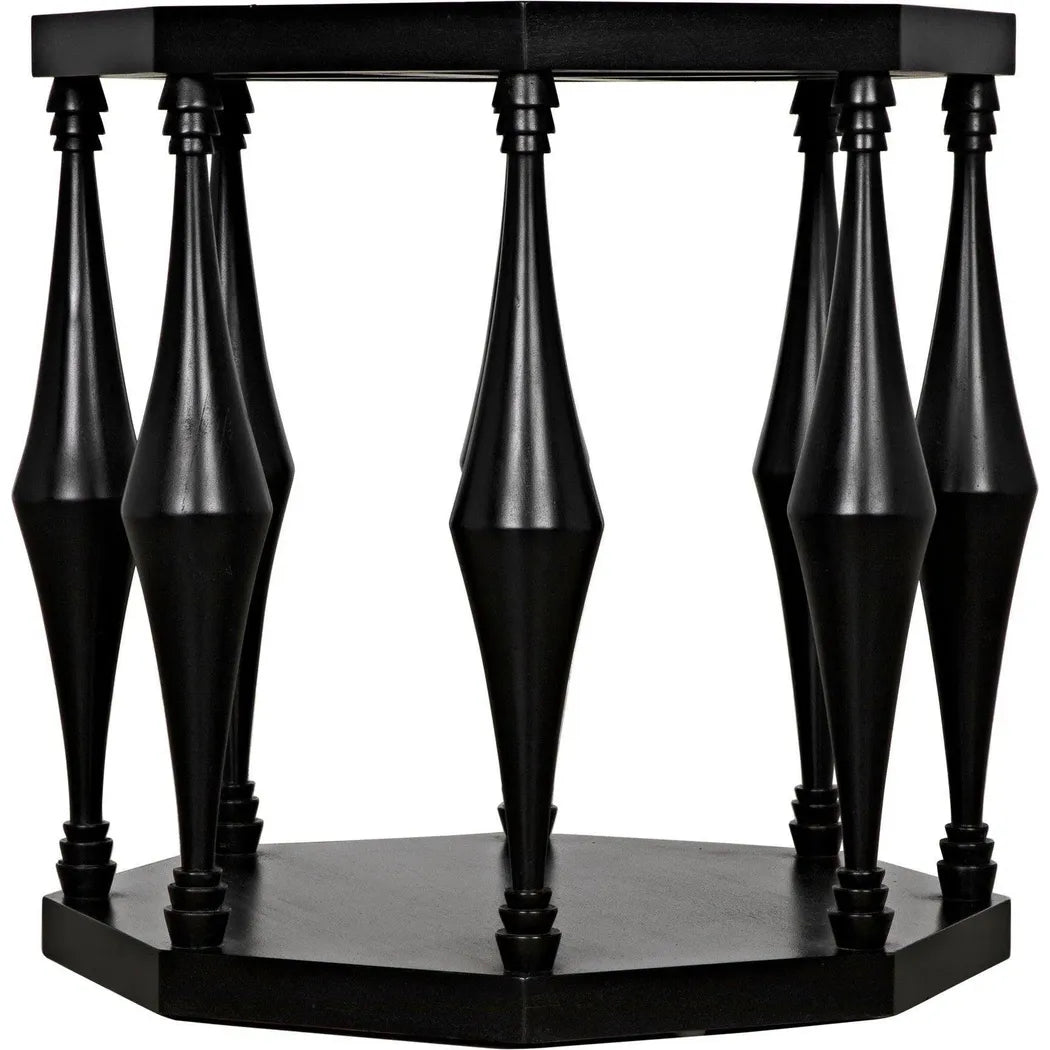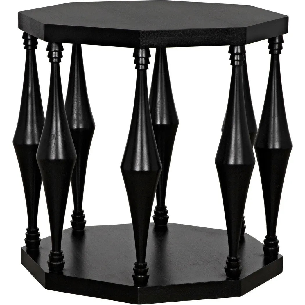 The Marceo Side Table is a statement piece that exudes elegance and versatility. Crafted with an octagonal top and bottom, supported by eight conical spokes with tiered detailing, it adds a modern touch to any room. The expertly hand-rubbed black finish creates a lustrous and eye-catching look, making it both functional and visually appealing. Trust in its high-quality construction to elevate your space. This end table features an octagonal top and bottom supported by eight conical spokes with tiered detail, creating a modern and eye-catching look. Expertly crafted and finished with a lustrous hand-rubbed black finish, it is both functional and beautiful.