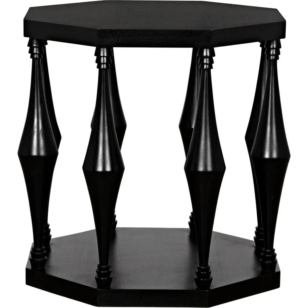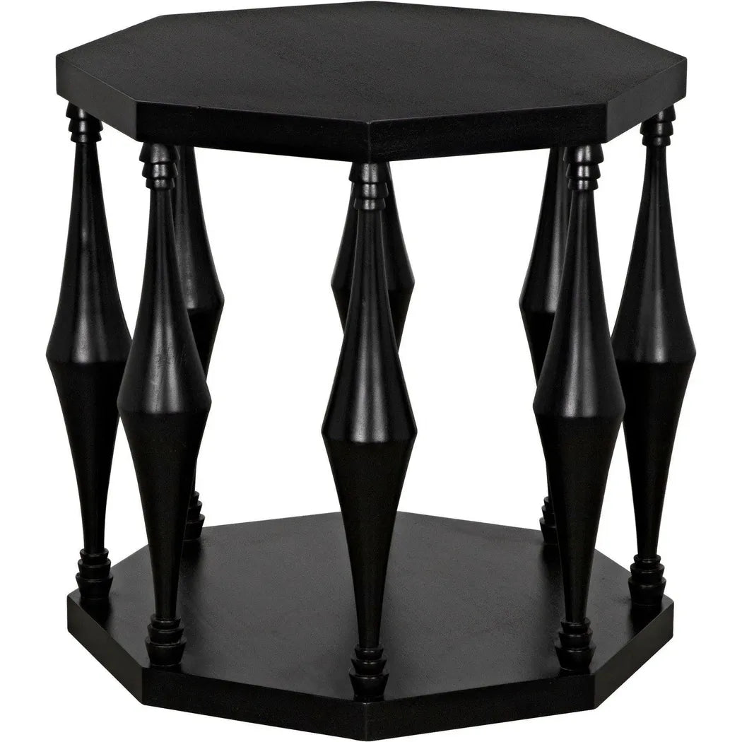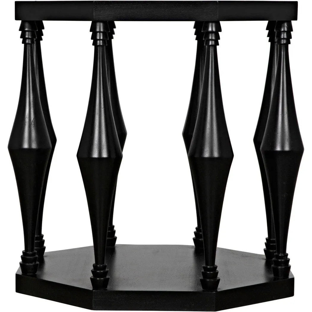 The Marceo Side Table is a statement piece that exudes elegance and versatility. Crafted with an octagonal top and bottom, supported by eight conical spokes with tiered detailing, it adds a modern touch to any room. The expertly hand-rubbed black finish creates a lustrous and eye-catching look, making it both functional and visually appealing. Trust in its high-quality construction to elevate your space. This end table features an octagonal top and bottom supported by eight conical spokes with tiered detail, creating a modern and eye-catching look. Expertly crafted and finished with a lustrous hand-rubbed black finish, it is both functional and beautiful.