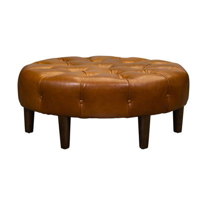The Marcoux Circular Tufted Ottoman is a perfect blend of style and comfort. With its spacious, round shape, this ottoman adds a touch of elegance to any room. Covered in Pippa Camel leather, it exudes a timeless charm. The tufted design not only enhances its visual appeal but also provides a plush seating experience. Crafted from top-quality materials like leather, foam, and wood, this ottoman promises durability and style. It's an ideal choice for living rooms or bedrooms, offering extra seating or a place to rest your feet.