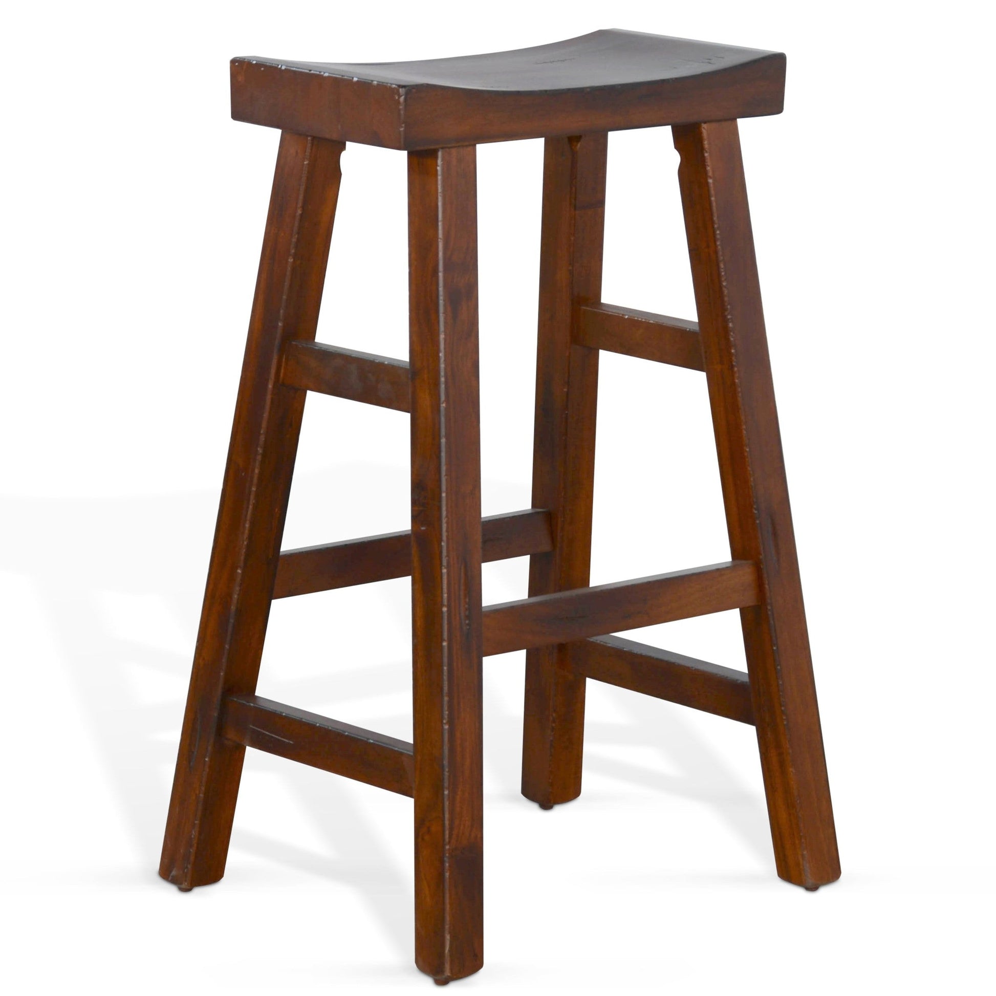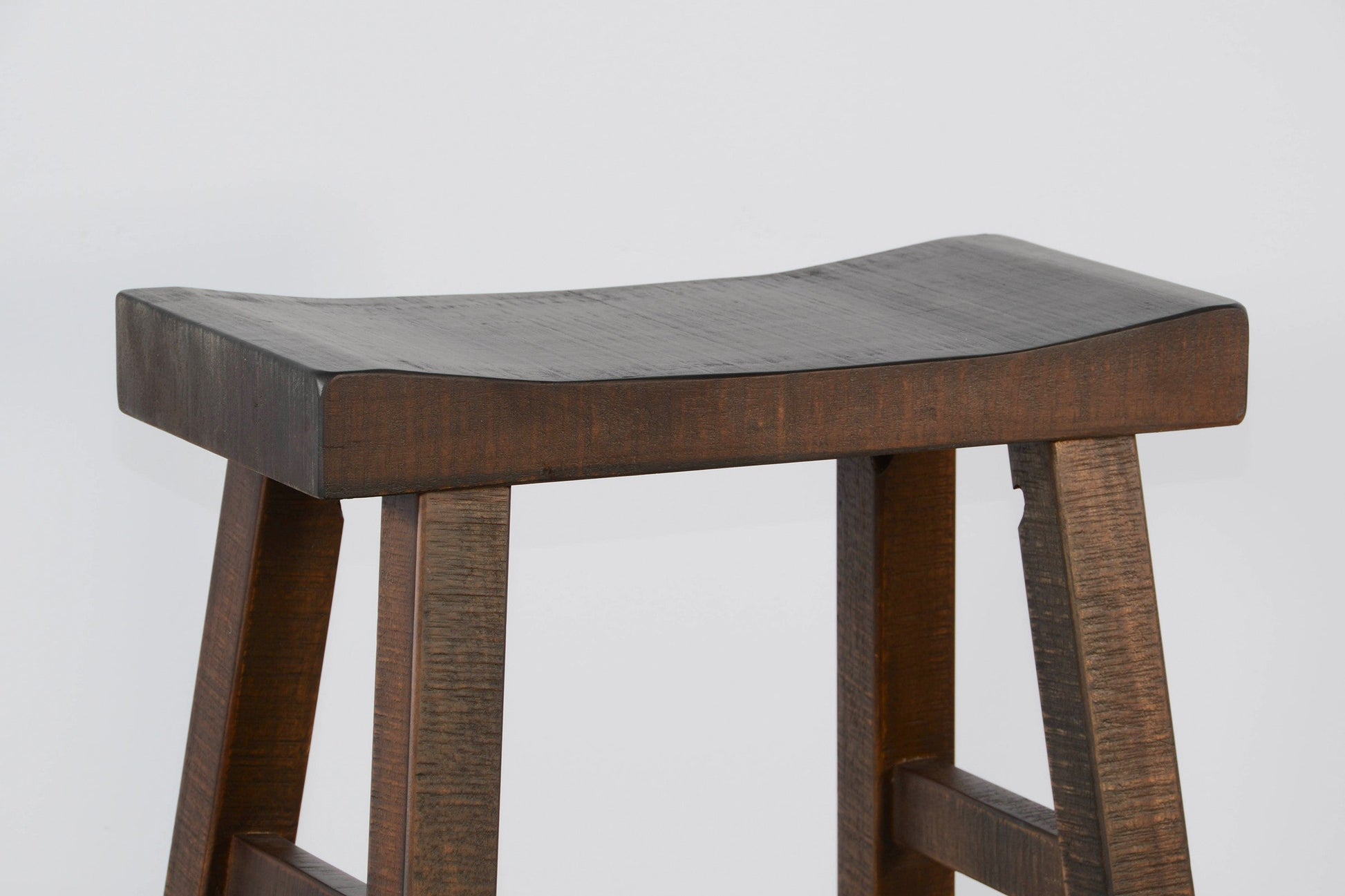 Bring a touch of casual charm to your home with this set of two Marina Saddle Stools. These stools offer a sturdy and stylish seating option with their solid mahogany construction and shabby chic style. The various color and distressed finish provide a warm, inviting look. Each stool features a comfortable scooped saddle seat and splayed legs for added stability. The horizontal wooden support is perfect for resting your feet, making these stools ideal for any kitchen or bar area. Easy to assemble, these stools combine functionality with a classic design that suits any decor.