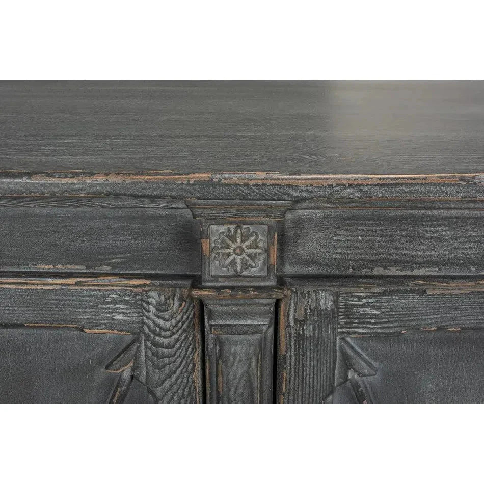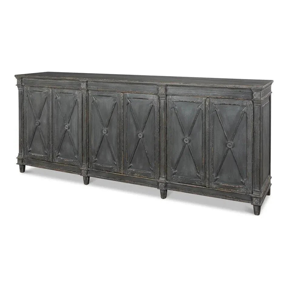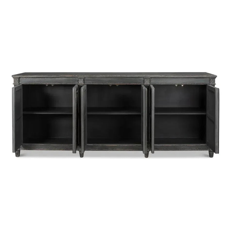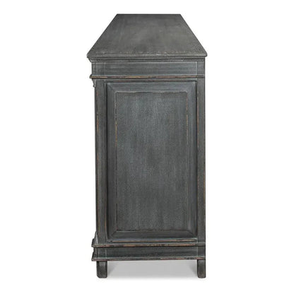 Discover the distinguished gentleman of your dining room with the Marksman Sideboard. Handcrafted from solid Reclaimed Pine, this 96-inch wide sideboard offers ample storage space for your finest dinnerware and barware. Finished in a handsome charcoal grey with refined iron hardware, it's built to last for generations. Add sophistication and timeless style to your home with the Marksman Sideboard.