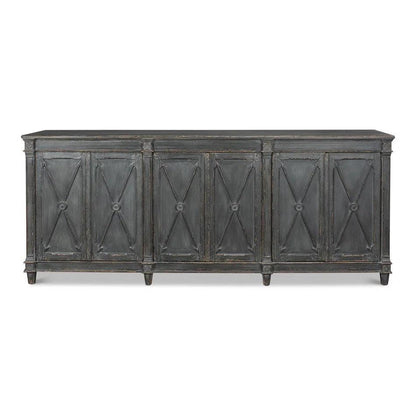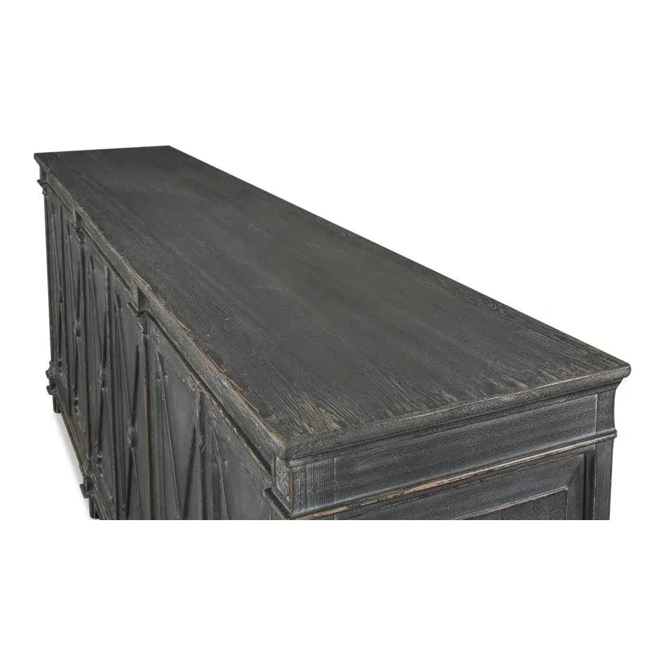 Experience timeless style and expert craftsmanship with the Marksman Sideboard. Its spacious 96-inch width offers ample storage for all your dining essentials, while the handsome charcoal grey finish and antiqued iron hardware add a refined touch. Handcrafted from solid Reclaimed Pine, this sideboard is built to last for generations. Make a refined statement in your dining room and showcase your finest dinnerware and barware with the distinguished gentleman of furniture.
