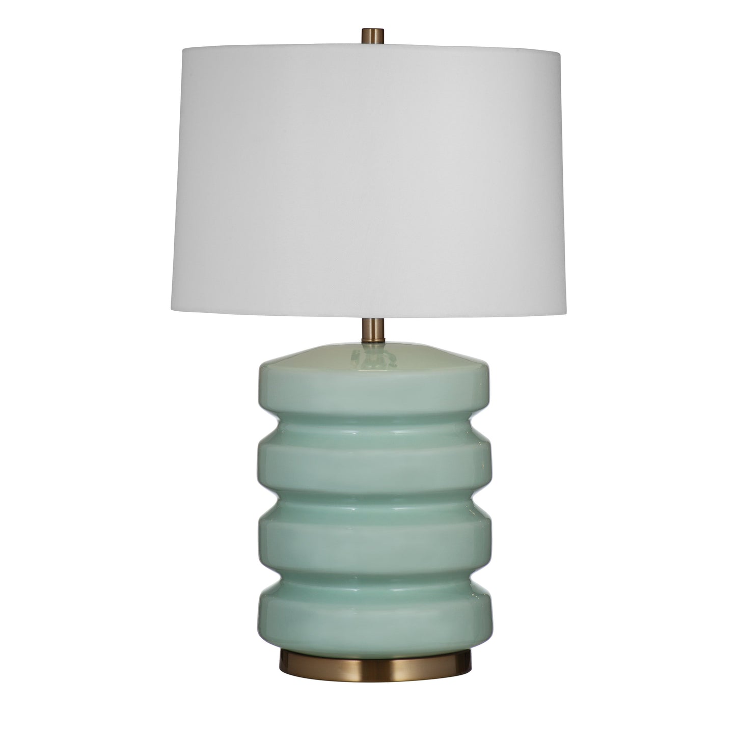 The Marzz Table Lamp is crafted of ceramic and metal and features a drum shade. Finished in light green and antique brass. Features include a 3 way switch. The hand crafted details produced by a skilled artist lends itself to a unique technique and will vary slightly. Get ready to step into the light and add a touch of originality to any room!