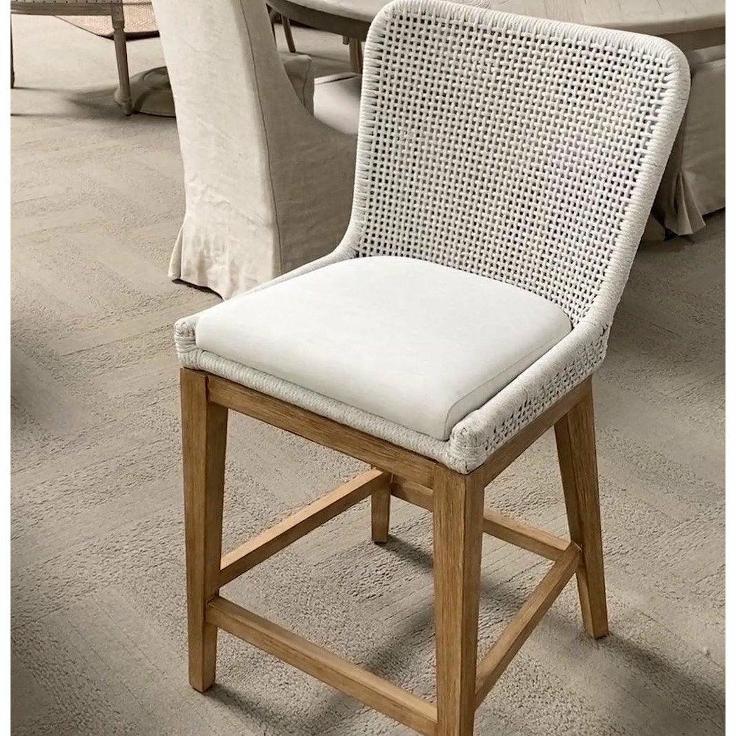 Experience elevated sophistication and impeccable craftsmanship with our Mesh Counter Stool. Boasting a solid Mahogany base and an intricate rope weave design, this transitional-style stool exudes luxury. The comfortable seat adds a touch of opulence, making it a true masterpiece in both form and function. Elevate your space with this exquisite counter stool and add a sense of exclusivity to your home. Mesh Counter Stool White Speckle Flat Rope and Seat, Natural Gray Mahogany Sophisticated and elegant, this transitional style counter stool features a solid Mahogany base and an intricate rope weave design. Experience true luxury and impeccable craftsmanship with this Mesh Counter Stool, guaranteed to elevate any space. The comfortable seat ensures a pleasurable experience while the solid Mahogany base and intricate design add a touch of sophistication and exclusivity.