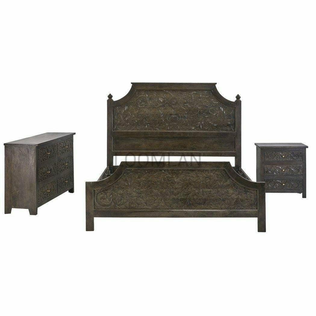 Hand Carved Dark Stain Wood Panel King Bed Features