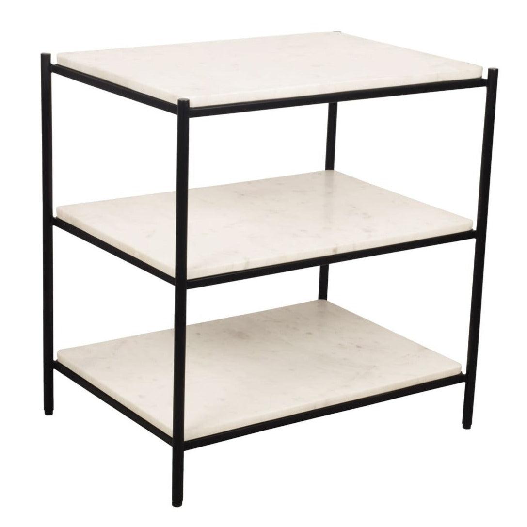 The Trine multipurposed accent table/nightstand builds a story around elemental bursts of marble and iron. Three tiers of white marble are joined together by a sturdy semi-gloss iron frame to create something that is as functional as it is elegant. This versatile table keeps things neat and organized in any room setting. Create a sophisticated and organized space with the Trine Multipurpose White Marble Accent Table Nightstand. Crafted with elemental bursts of marble and iron, this three-tiered masterpiece exudes taste and exclusivity. The sturdy semi-gloss iron frame seamlessly connects the white marble tiers to provide functionality and elegance. Perfect for any room, this versatile table will elevate the style and organization of your home.