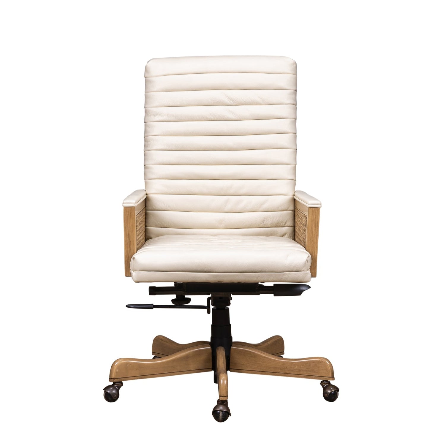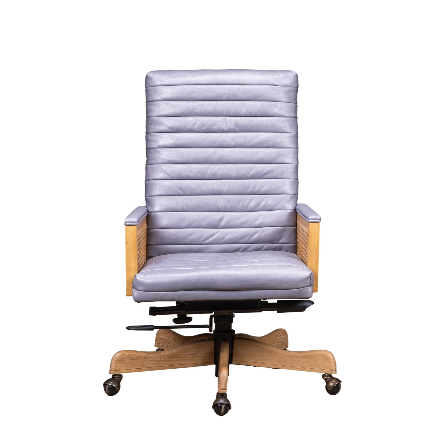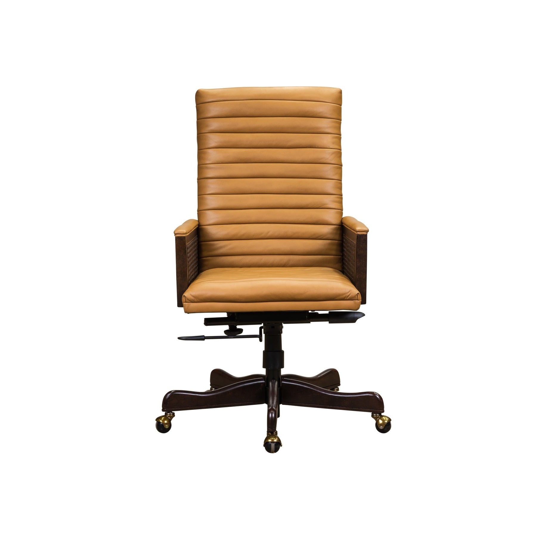 The wooden armrests with woven detailing and the dark wood base with five caster wheels add elegance and functionality. The chair is available in different finishes, including Murray Camel, Anniston Slate, Anderson Pebble, and Ashland Pearl, each bringing its own unique appeal. Its ergonomic design and quality craftsmanship make it the perfect choice for any office setting.