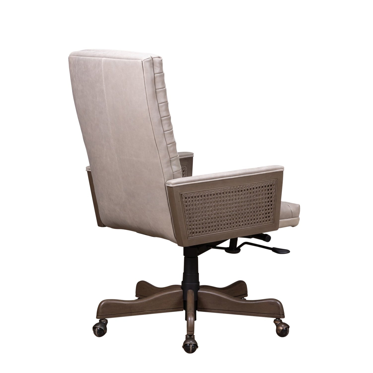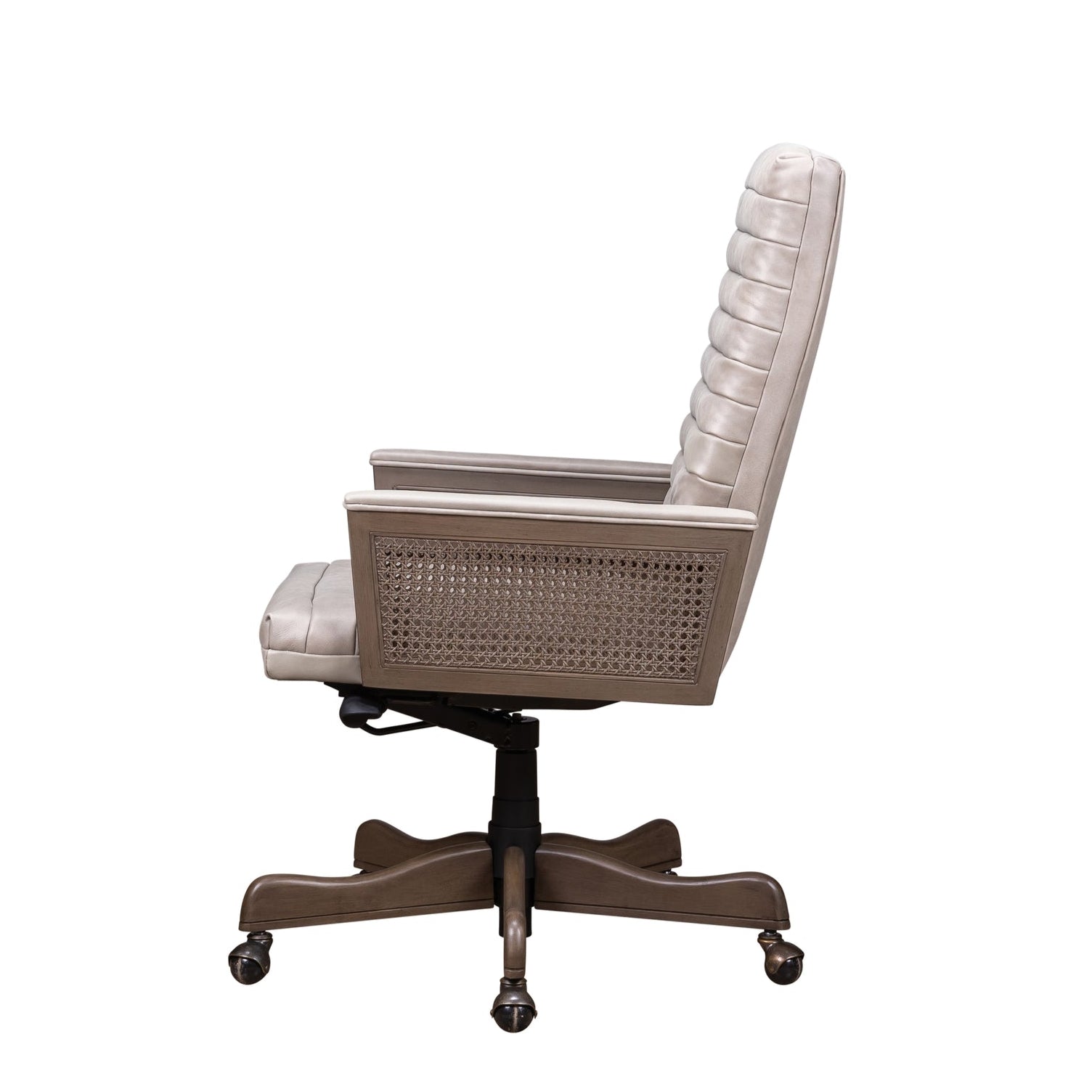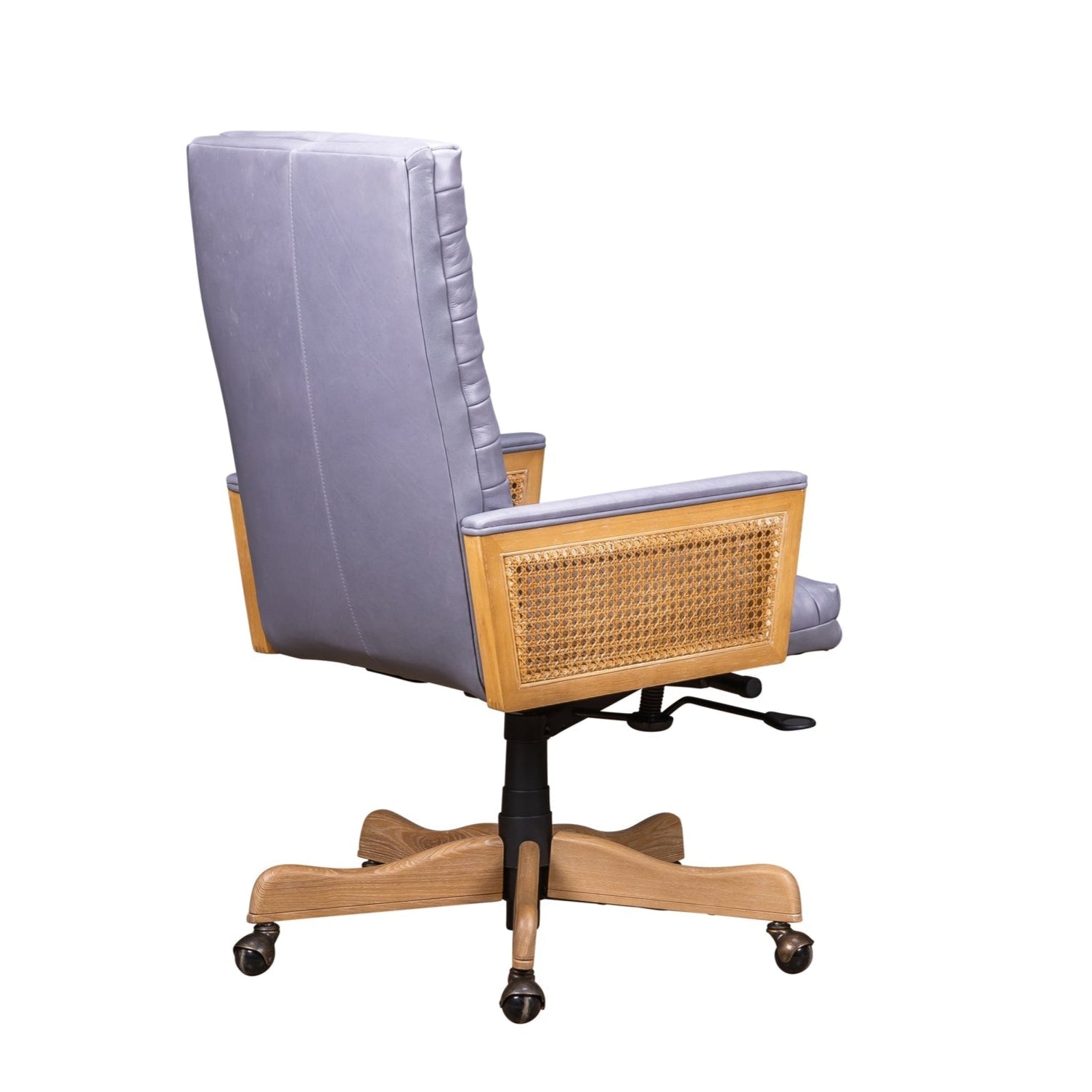 The wooden armrests with woven detailing and the dark wood base with five caster wheels add elegance and functionality. The chair is available in different finishes, including Murray Camel, Anniston Slate, Anderson Pebble, and Ashland Pearl, each bringing its own unique appeal. Its ergonomic design and quality craftsmanship make it the perfect choice for any office setting.