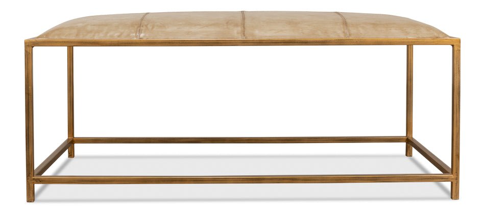 The Montvale Coffee Table Bench brings a touch of elegance to any living space. This piece is designed with a luxurious leather cover in an Antique Vellum finish, providing a sophisticated look that fits seamlessly into contemporary settings. The brass-toned frame adds a subtle yet striking contrast, enhancing its visual appeal. Whether used as a coffee table or a bench, it serves as a versatile addition to your home, offering both style and functionality.