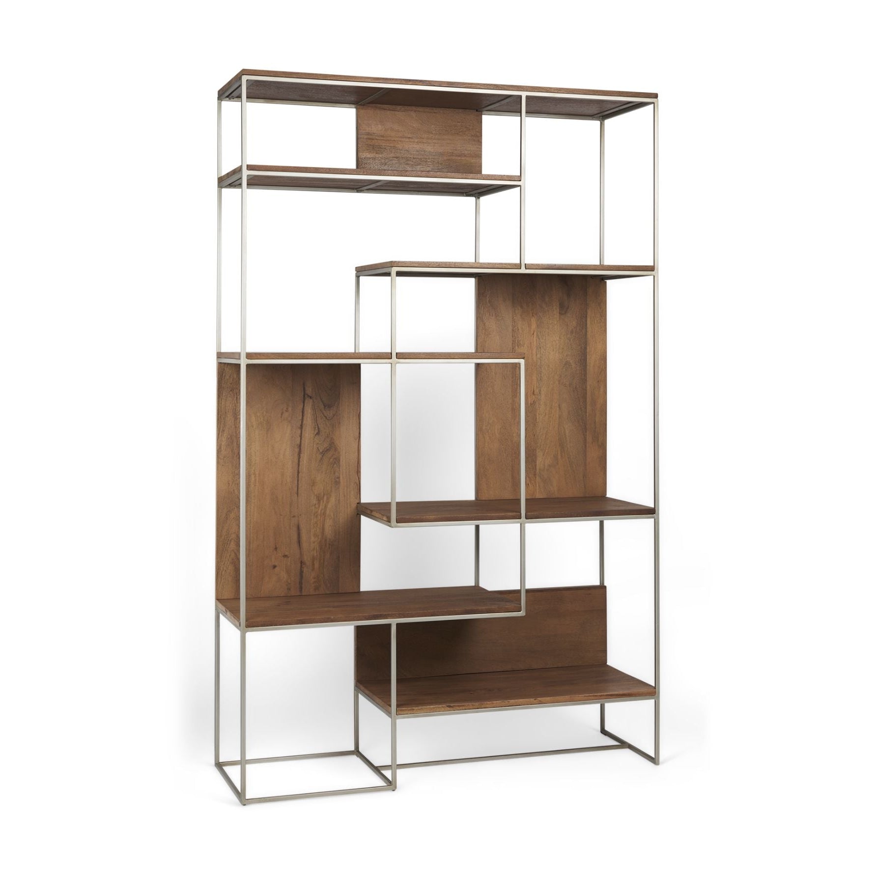 - The Morris features a metal chassis complemented by mango wood shelves that is finished in a natural light brown palette.