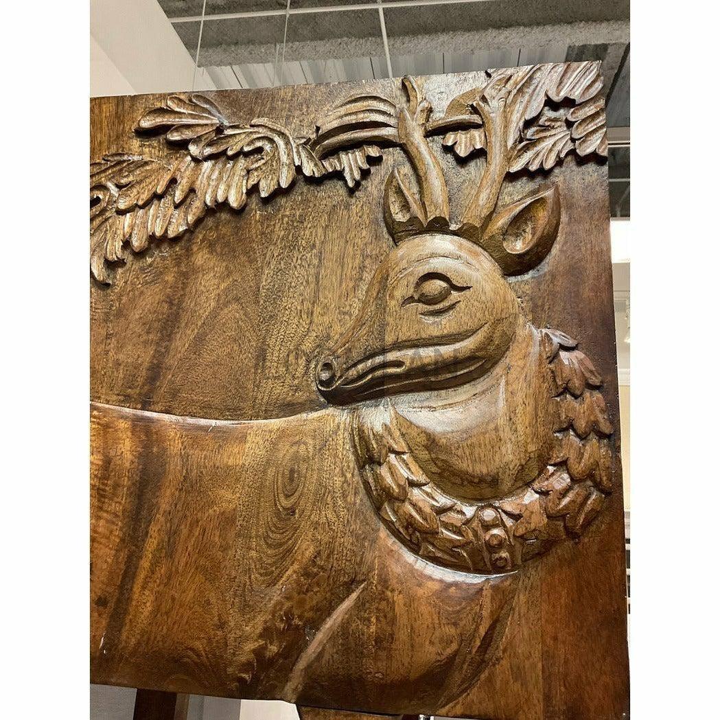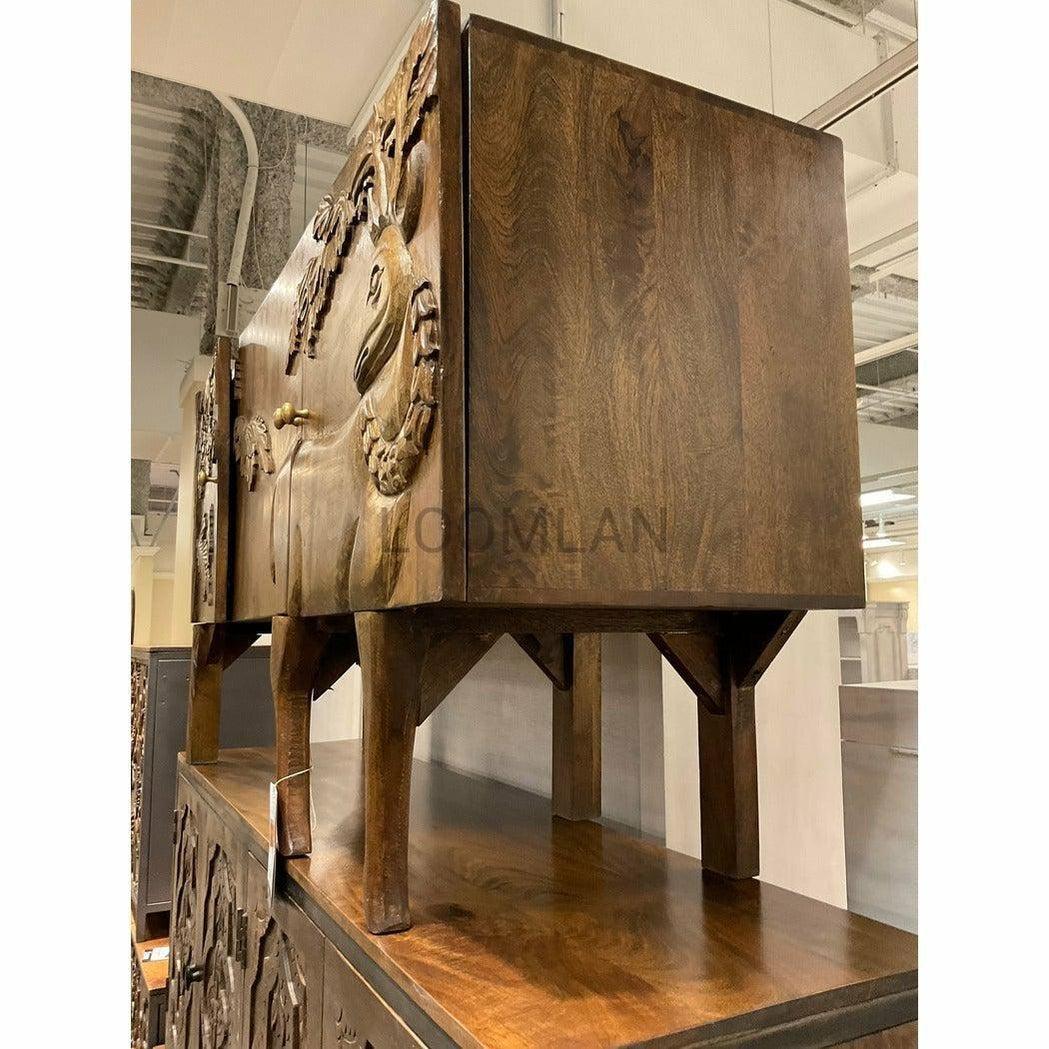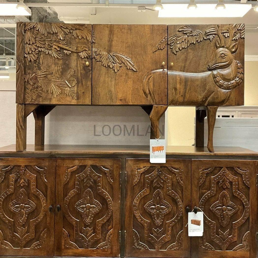 Add a touch of nature to your dwelling with this opulent Mother Nature sideboard, adorned with intricately hand-carved deer front doors and crafted from solid mango wood. The stunning details of the deer and its botanical habitat exude elegance, while the sturdy legs provide unwavering support. Meticulously constructed using masterful techniques, this cabinet is sure to become a cherished family heirloom. With its heavily carved doors depicting a detailed deer in its natural environment, this unique sideboard cabinet seamlessly brings the beauty of nature indoors.